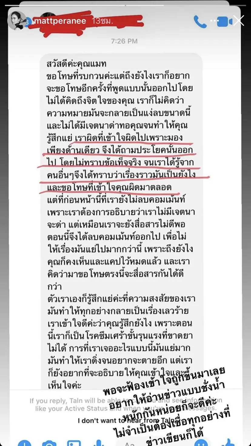 ล่าสุด ด้านสตอรี่อินสตาแกรมของสาวแมท ก็ได้มีการแคปภาพข้อความที่ชาวเน็ตส่งมาขอโทษแบบร่ายยาว ซึ่งด้านสาวแมทก็ได้มีการพิมพ์ข้อความลงไปว่า “พอจะฟ้องเข้าใจถูกขึ้นมาเลย อยากให้อ่านข่าวแบบชั่งน้ำหนักกันหน่อยก็จะดีค่ะ ไม่จำเป็นต้องเชื่อทุกอย่างที่ข่าวเขียนก็ได้”