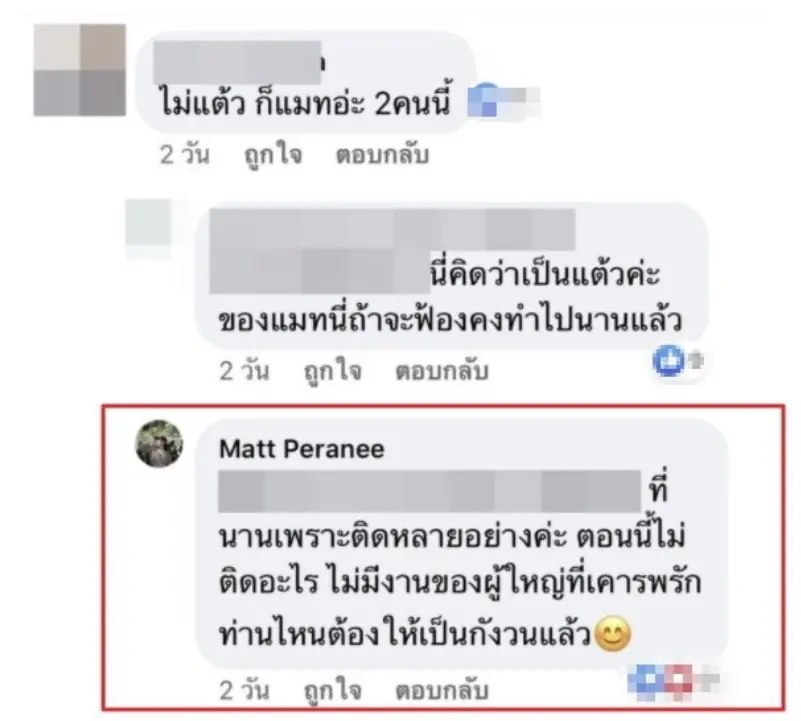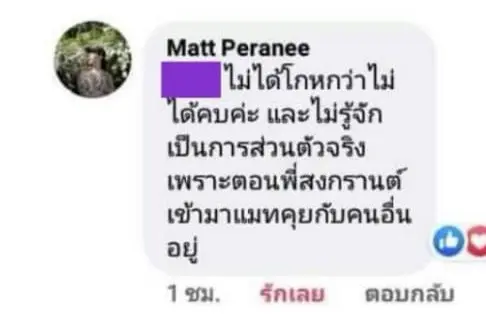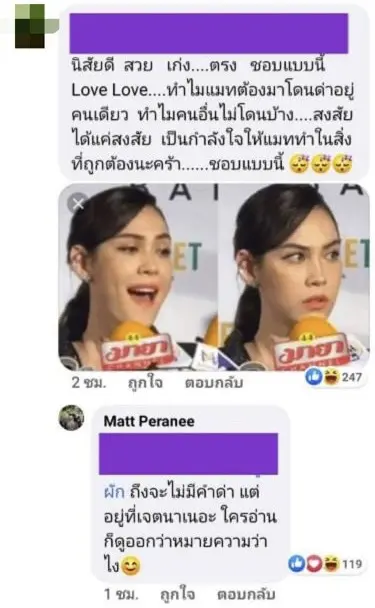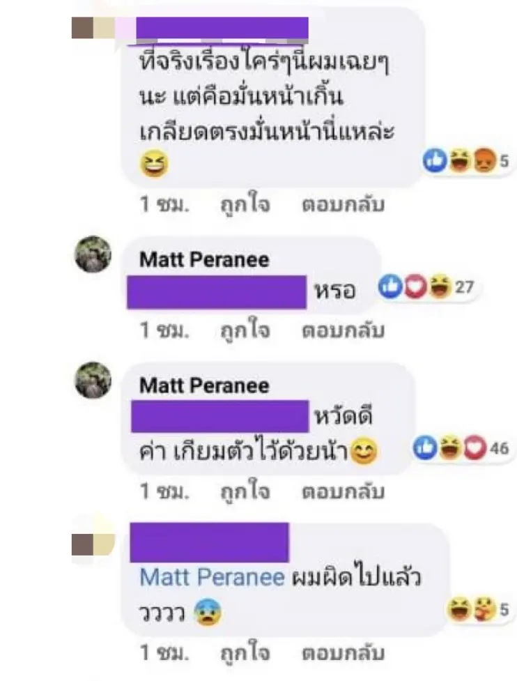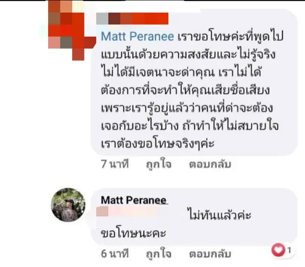 งานนี้ เจ้าตัว ถึงกับมาคอมเมนต์ตอบเอง ด้วยข้อความว่า “ที่นานเพราะติดหลายอย่างค่ะ ตอนนี้ไม่ติดอะไร ไม่มีงานของผู้ใหญ่ที่เคารพรักท่านไหนต้องให้เป็นกังวลอีกแล้ว” ทำเอาชาวเน็ตสะดุ้งกันเป็นแถว เรียกได้ว่า สำนึกผิดกันไม่ทันโดย แมท ภีรนีย์ ได้ใช้เฟซบุ๊กส่วนตัว ชื่อว่า “Matt Peranee” เข้ามาคอมเมนต์ตอบ จวกรายบุคคล ทำเอาชาวเน็ตต่างเข้ามาขอโทษสาวแมทกันยกใหญ่ แต่ก็ไม่ทันแล้วจ้ะ