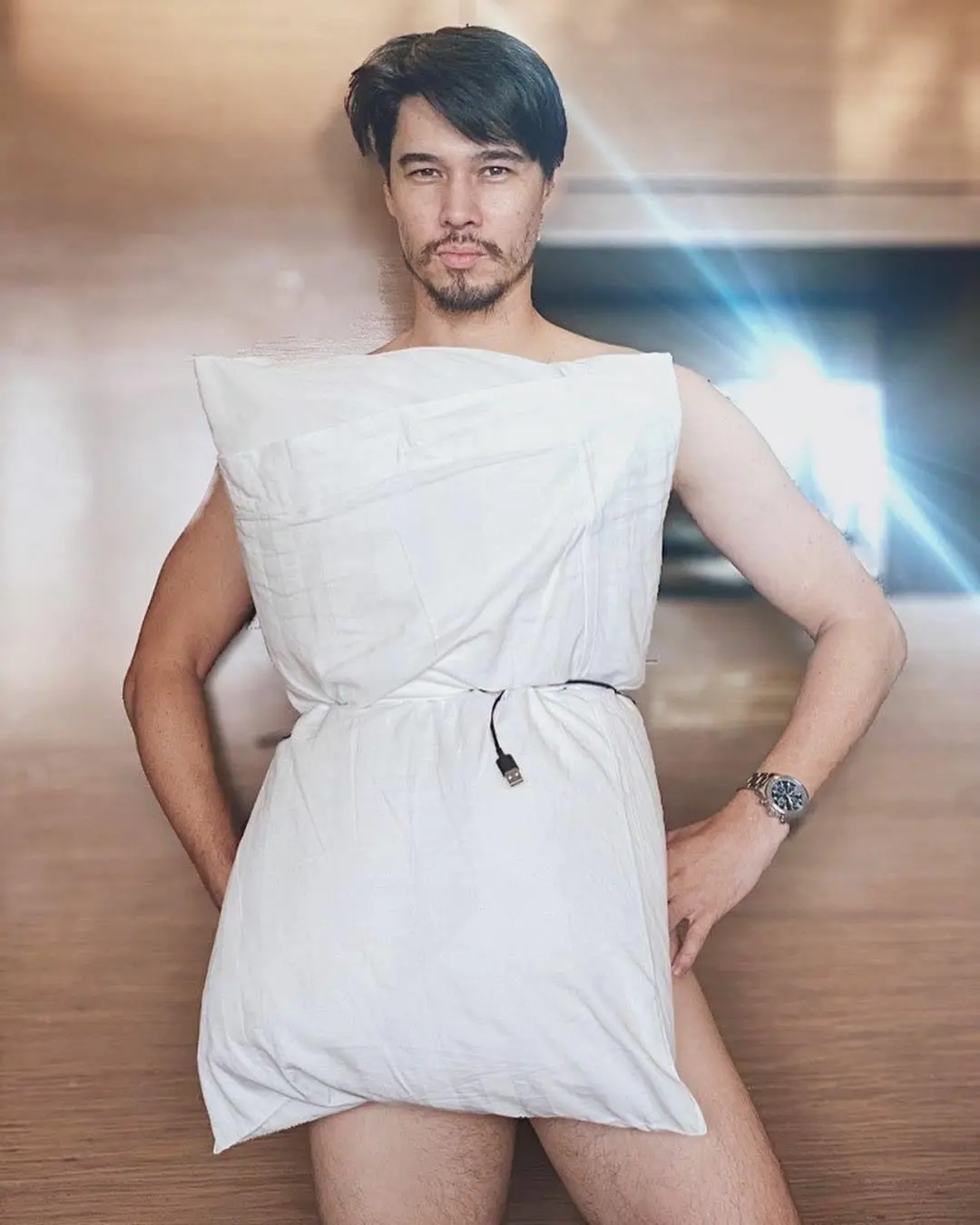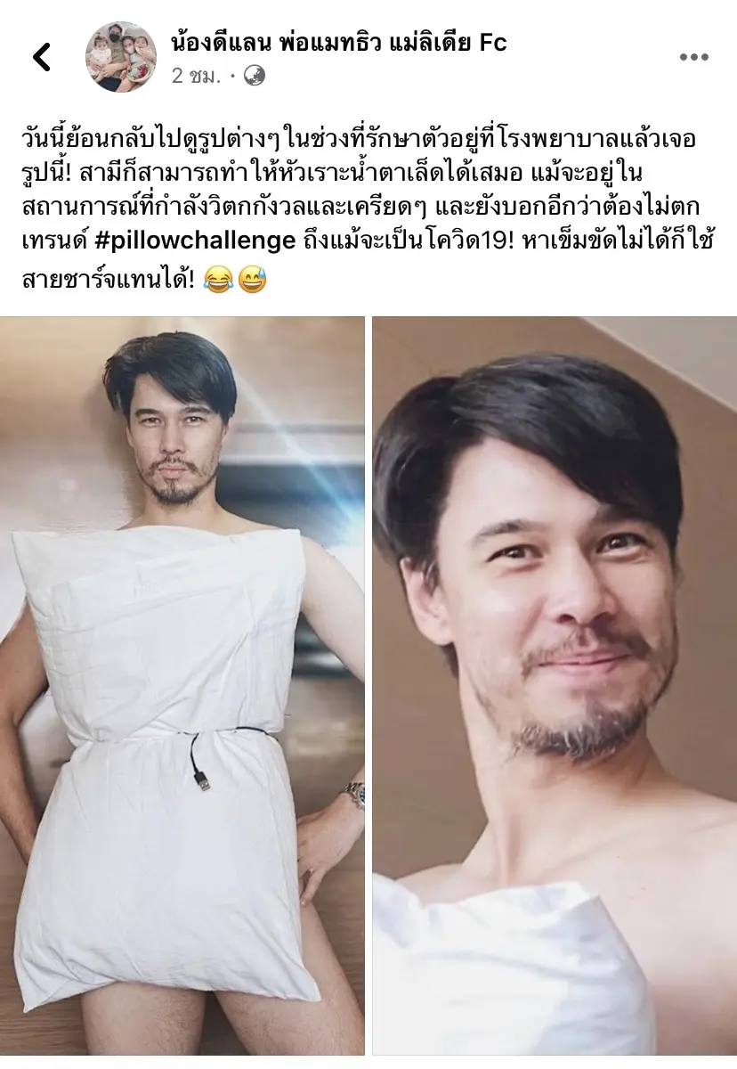 พร้อมข้อความว่า “วันนี้ย้อนกลับไปดูรูปต่างๆในช่วงที่รักษาตัวอยู่ที่โรงพยาบาลแล้วเจอรูปนี้! สามีก็สามารถทำให้หัวเราะน้ำตาเล็ดได้เสมอ แม้จะอยู่ในสถานการณ์ที่กำลังวิตกกังวลและเครียดๆ และยังบอกอีกว่าต้องไม่ตกเทรนด์ #pillowchallenge ถึงแม้จะเป็นโควิด19! หาเข็มขัดไม่ได้ก็ใช้สายชาร์จแทนได้! ??”