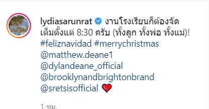 ล่าสุด สาวลิเดีย และแมทธิวก็ได้จูงมือกันไปร่วมงานโรงเรียนของน้องดีแลน ที่โรงเรียน ISB International School Bangkok พร้อมกับจัดเต็มแต่งตัวแบบเข้าธีมวันคริสมาสต์กันทุกคนทั้งคุณพ่อ คุณแม่ และคุณลูก โดยสาวลิเดียก็ได้มาโพสต์รูปน่ารักๆ นี้ลงในไอจีส่วนตัว พร้อมกับลงคลิปที่เธอ และแมทธิวได้ขึ้นไปร้องเพลงร่วมกับเด็กๆ บนเวทีอีกด้วย