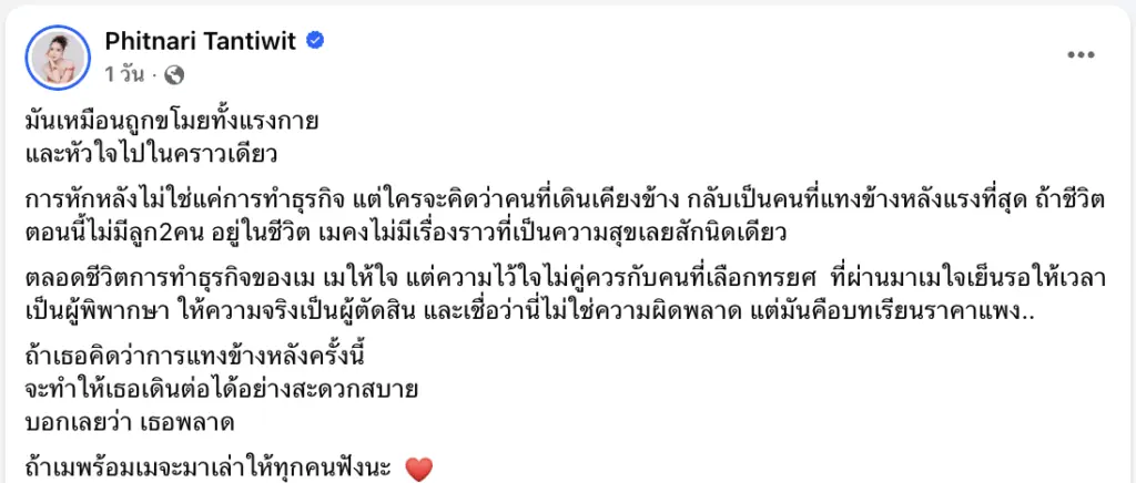 กลายเป็นดราม่าร้อนแรงในแวดวงธุรกิจออนไลน์ เมื่อ เม พรีมายา ผู้ก่อตั้งแบรนด์อาหารเสริมชื่อดัง ออกมาโพสต์ข้อความระบายความรู้สึกผ่านเฟซบุ๊กส่วนตัวอย่างดุเดือดว่า เธอถูกคนใกล้ชิดที่สุดหักหลัง และฮุบธุรกิจที่เธอสร้างมากับมือ โดยระบุว่า คนเหล่านี้คือ “พี่” และ “เพื่อนสนิท” ที่เคยร่วมทุกข์ร่วมสุขกันมาก่อน