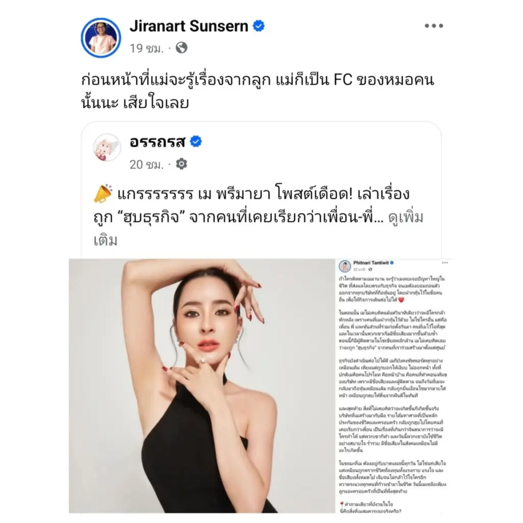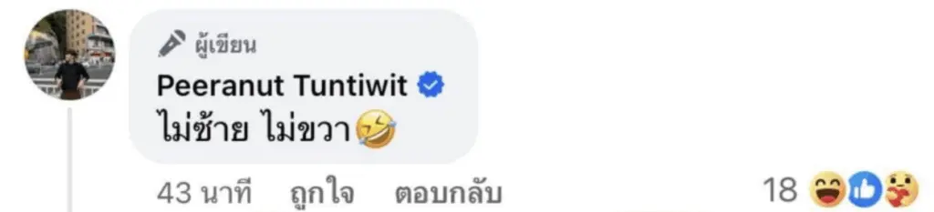 - คุณบิ๊ก น้องชายของเม แชร์โพสต์ของพี่สาว พร้อมคอมเมนต์สั้น ๆ ว่า “ไม่ซ้าย ไม่ขวา” ซึ่งหลายคนตีความว่าอาจหมายถึงการไม่เลือกข้างในความขัดแย้งครั้งนี้