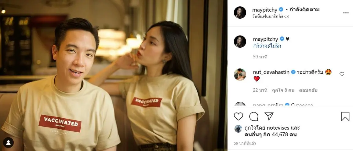 ส่วนความเคลื่อนไหวของ เมย์ พิชญ์นาฏ หลังชาวเน็ตเข้าไปถล่มคอมเมนต์ถามเจ้าตัวเรื่องผู้กำกับโจ้ เจ้าตัวได้โพสต์ภาพคู่ กับคนรักในปัจจุบัน โดยสวมเสื้อคู่มีตัวหนังสือว่า vaccinated ซึ่งแปลว่า ฉีดวัคซีนแล้ว พร้อมระบุแคปชันโพสต์ว่า #ก็ว่าจะไม่รัก และเช็กอินว่า วันนี้แฟนน่ารักจัง <3