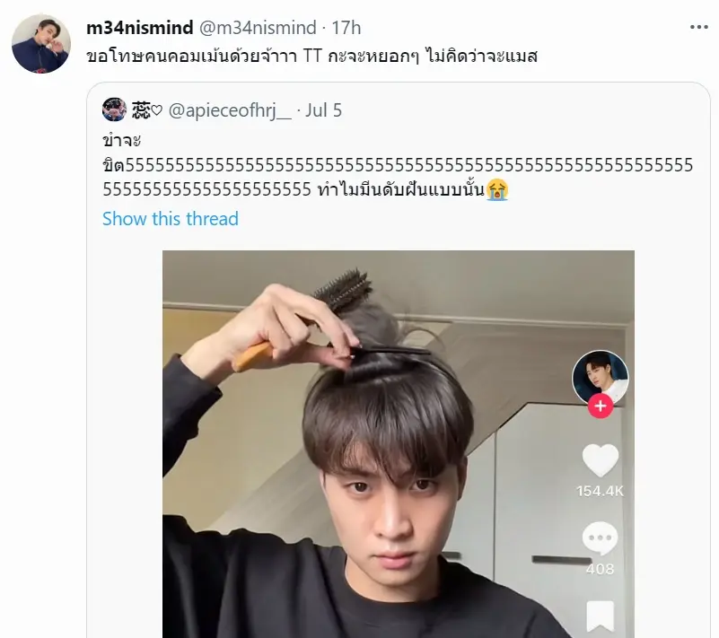 หลังจากนั้นไม่นานประเด็นดังกล่าวก็ถูกพูดถึงกันอย่างแพร่หลายในโลกทวิตเตอร์ ซึ่งหนุ่มมีน ก็ได้ออกมาเคลื่อนไหวอย่างทันทีด้วยความเอ็นดูว่า ขอโทษคนคอมเม้นด้วยจ้าาา TT กะจะหยอกๆ ไม่คิดว่าจะแมส
