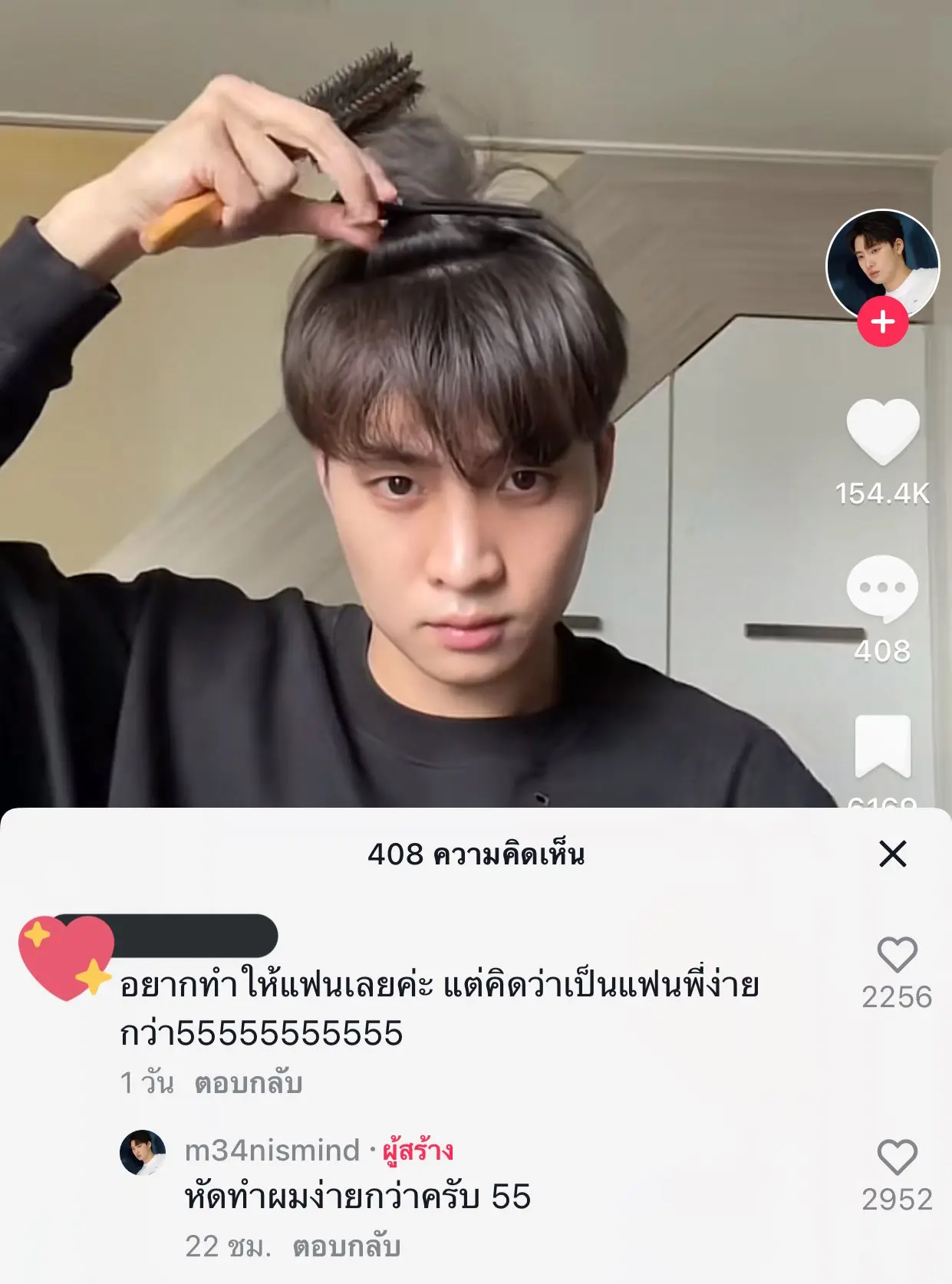 ขณะเดียวกันด้านแฟน ๆ ก็แห่เข้ามาคอมเมนต์กันเป็นจำนวนมาก แต่ก็มีหนึ่งคอมเมนต์เข้ามาคอมเมนต์ชวนสะดุดว่า อยากทำให้แฟนเลยค่ะ แต่คิดว่าเป็นแฟนพี่ง่ายกว่า55555555555 ทันใดนั้นเอง มีน ก็ได้เข้าไปตอบกลับแบบแซวเล่นว่า หัดทำผมง่ายกว่าครับ 55
