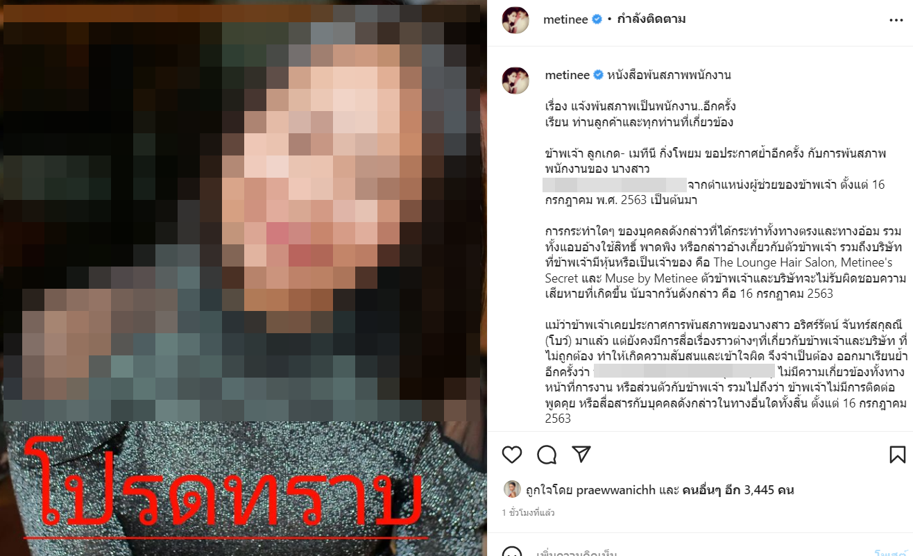 การกระทำใดๆ ของบุคคลดังกล่าวที่ได้กระทำทั้งทางตรงและทางอ้อม รวมทั้งแอบอ้างใช้สิทธิ์ พาดพิง หรือกล่าวอ้างเกี้ยวกับตัวข้าพเจ้า รวมถึงบริษัทที่ข้าพเจ้ามีหุ้นหรือเป็นเจ้าของ คือ The Lounge Hair Salon, Metinee’s Secret และ Muse by Metinee ตัวข้าพเจ้าและบริษัทจะไม่รับผิดชอบความเสียหายที่เกิดขึ้น นับจากวันดังกล่าว คือ 16 กรกฏาคม 2563