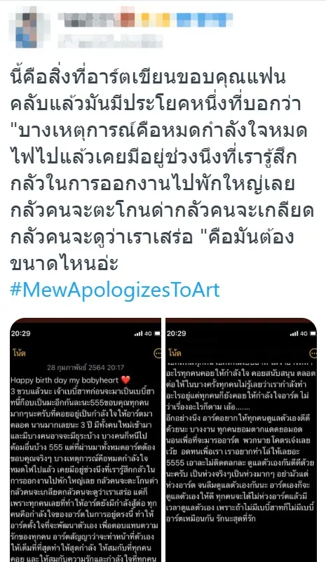 “แล้วอีกเรื่องนึงคือการไม่พอใจแล้วโพสต์ในทวิต อาร์ตรู้สึกว่า การโพสต์ในทวิตอ่ะ มันไม่ได้มีผลดีกับเราทั้งคู่เลย ไม่ใช่แค่อาร์ต อาร์ตโดนด่า อาร์ตไม่เคยตอบโต้เลย อาร์ตไม่เคยตอบโต้พี่มิวเลย มีแต่ทักไปหลังไมค์ พี่มิวเป็นอะไร เคลียร์กันนะ อย่างที่ทุกคนก็รู้ มันหลายครั้งมาก ที่เขาโพสต์ แล้วอาร์ตไม่ตอบโต้ มันไม่จำเป็นที่จะต้อง เรามาเพื่อสร้างความสุขให้ทุกคน เรามาอยู่จุดนี้ ณ จุดนี้ ที่เราทำหน้าที่อยู่ตรงนี้ เราทำเพื่อทุกคนเว้ย ทำเพื่อทุกคนจริง ๆ เราทำให้ทุกคนมีความสุข เราแฮปปี้ เราไม่เคยเก็บมาแบบ เราไม่น่าทำเลย ไม่มี ไม่มีเลย ไม่มีเลยแม้แต่ครั้งเดียว แต่เราคิดว่า มันไม่ควรที่จะโพสต์อ่ะ จนถึงครั้งสุดท้าย น้องเลือกที่จะไม่พูด น้องเลือกที่จะ โอเค เขาไม่เคยฟังเราเลย มันบั่นทอนจิตใจของทุกคน แล้วอาร์ตด้วย ทุกคนคิดดู เขาเคยพูดว่า มีอะไรให้พูด แล้วเขาก็โพสต์ทวิต เขากลับไม่พูดกับเราตั้งแต่แรก แล้วอาร์ตคุยทุกรอบ ทุกรอบเลย ทุกครั้งที่เขาโพสต์ทวิต อาร์ตคุยทุกรอบ จนครั้งล่าสุด อาร์ตไม่ไหวแล้ว ไม่ไหวจริง ๆ อ่ะ อาร์ตไม่รู้จะพูดไปทำไมแล้ว”