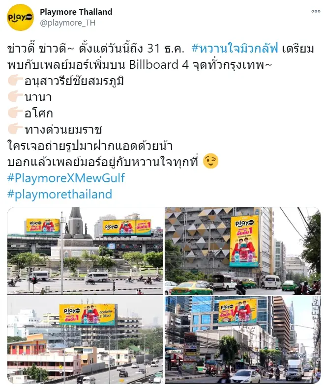 โดยทาง Playmore แบรนด์ลูกอมขนมชื่อดัง ที่ล่าสุดมีมิวกลัฟเป็นพรีเซ็นเตอร์ ก็น่าอุดหนุนสุด เพราะได้จัดเต็มป้ายโฆษณาที่ดูยังไง๊ ยังไง หนุ่มมิวหนุ่มกลัฟก็หวานกว่าลูกอมให้ ใครอยากไปเยี่ยมชม playmore th ก็ได้ชี้พิกัดไว้ทางทวิตเตอร์ตามภาพ