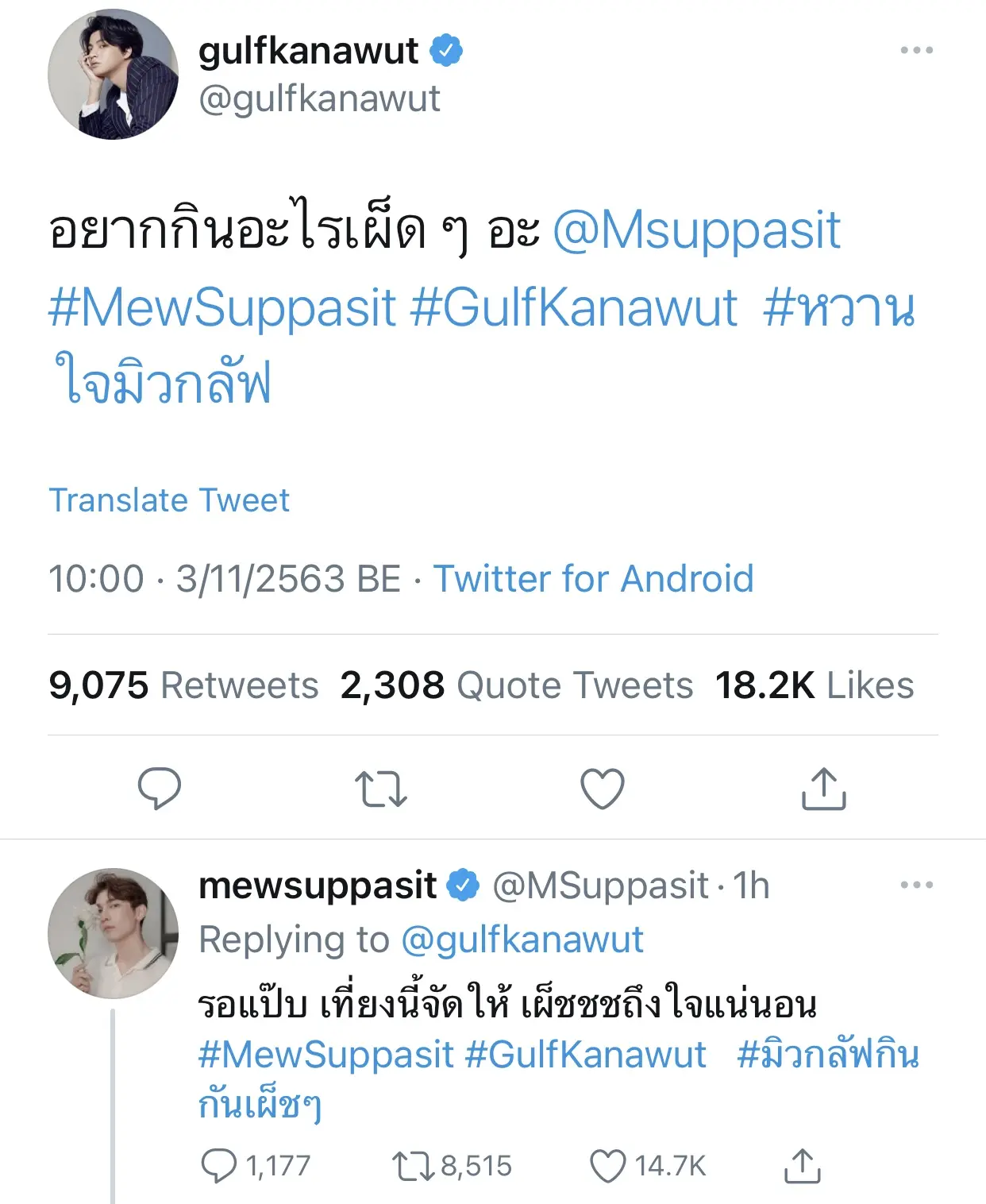 ล่าสุดหนุ่ม กลัฟ คณาวุฒิ เปิดประเด็น โพสต์ทวิตแล้วแท็กหาหนุ่ม มิว ศุภศิษฏ์ ว่า ‘อยากกินอะไรเผ็ดๆ อะ’ ว่าเขินแล้ว แต่หนุ่มมิวไม่น้อยหน้า มาแรงแซงโค้งตอบเมนชั่น ‘รอแป๊บ เที่ยงนี้จัดให้ เผ็ชชชถึงใจแน่นอน’ แถมแฮชแท็กให้แฟนๆหน้าแดงเล่น #มิวกลัฟกินกันเผ็ชๆ