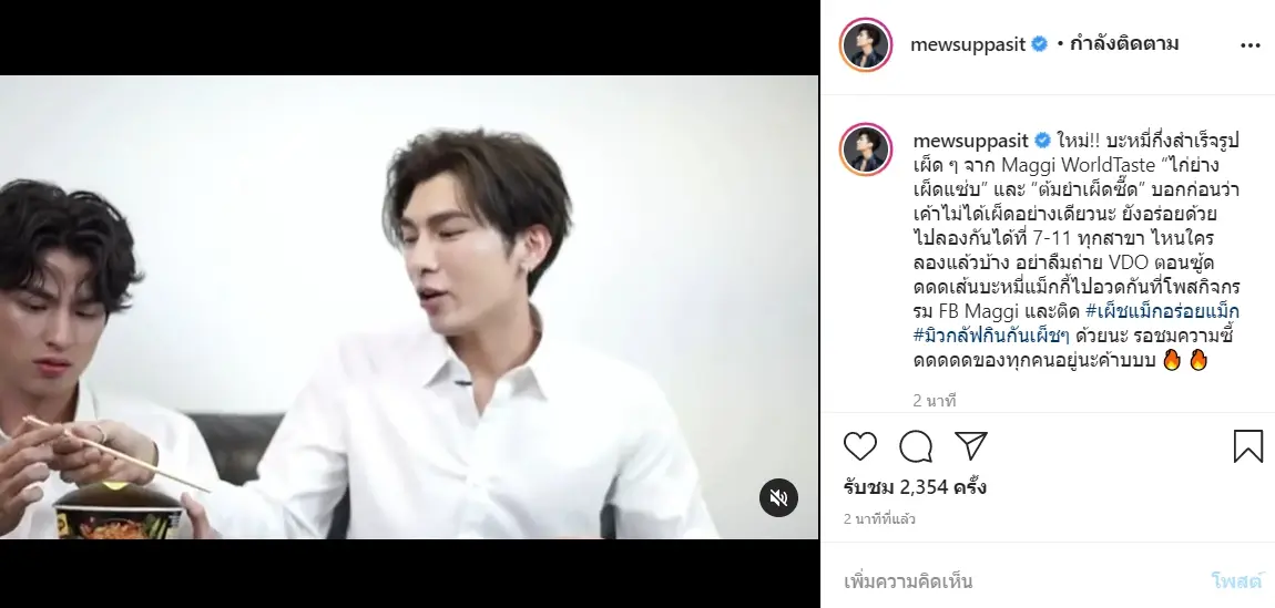 และก็มาตามนัด เพราะหนุ่ม มิว เฉลยแล้วว่าอะไรเผ็ดๆที่ว่า คือ บะหมี่กึ่งสำเร็จรูปเผ็ด ๆ จาก Maggi WorldTaste “ไก่ย่างเผ็ดแซ่บ” และ “ต้มยำเผ็ดซี๊ด” โดยปล่อยคลิปโฆษณาสั้นๆทางอินสตาแกรมส่วนตัวของหนุ่มมิว ทำแฟนคลับน้ำลายสอกันไปตามๆกัน ทีมหวานใจว่ายังไงค้า ต้องตำแล้วไหมแบบนี้!