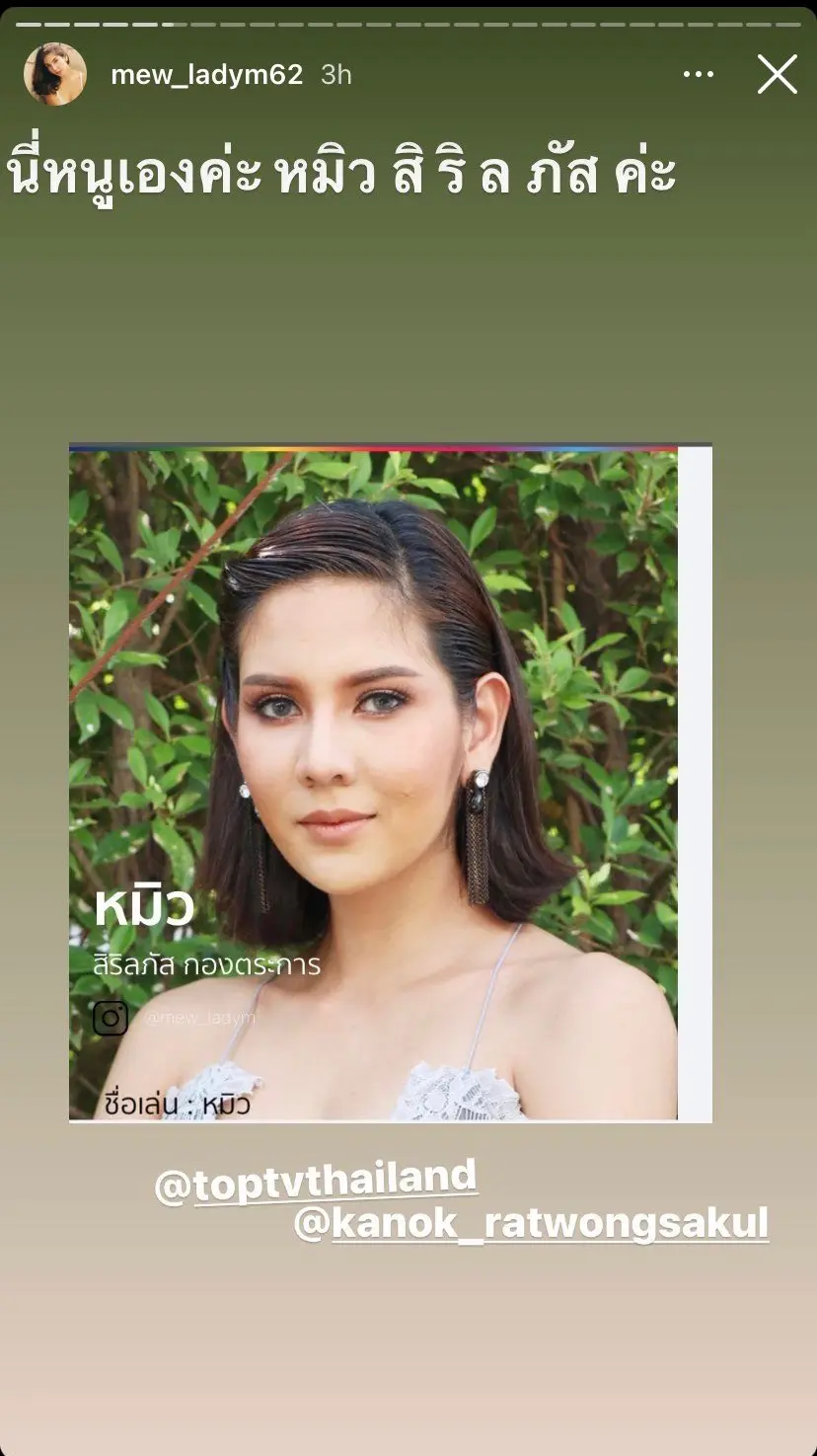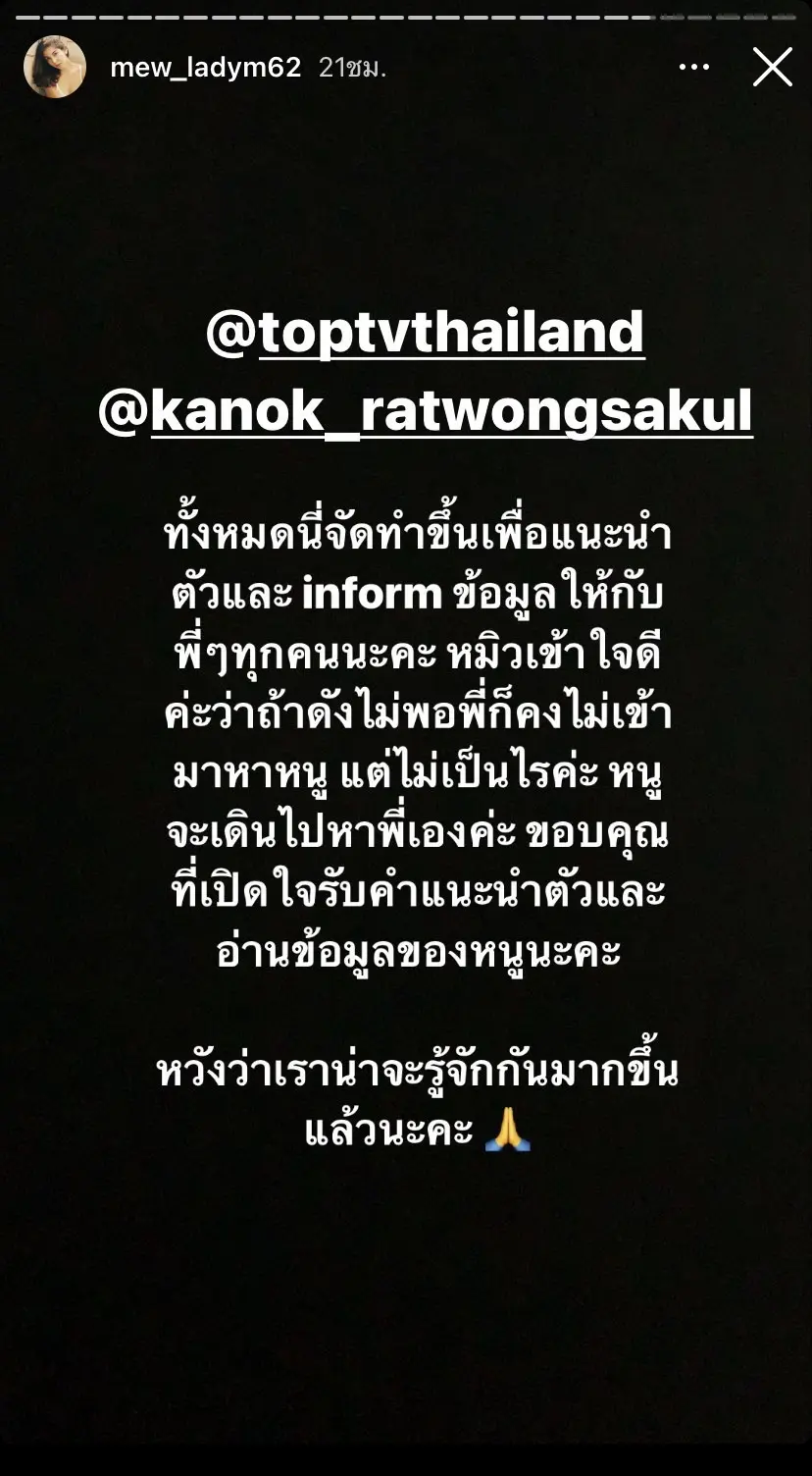 และ ล่าสุด สาวหมิว ก็ได้ออกมาโพสต์สตอรี่เรื่องราวแนะนำตัวพร้อมแท็ก กนก ลงอินสตาแกรมสิบกว่า สตอรี่ ทั้งนี้ ในสตอรี่หน้าสุดท้าย เธอได้กล่าวว่า