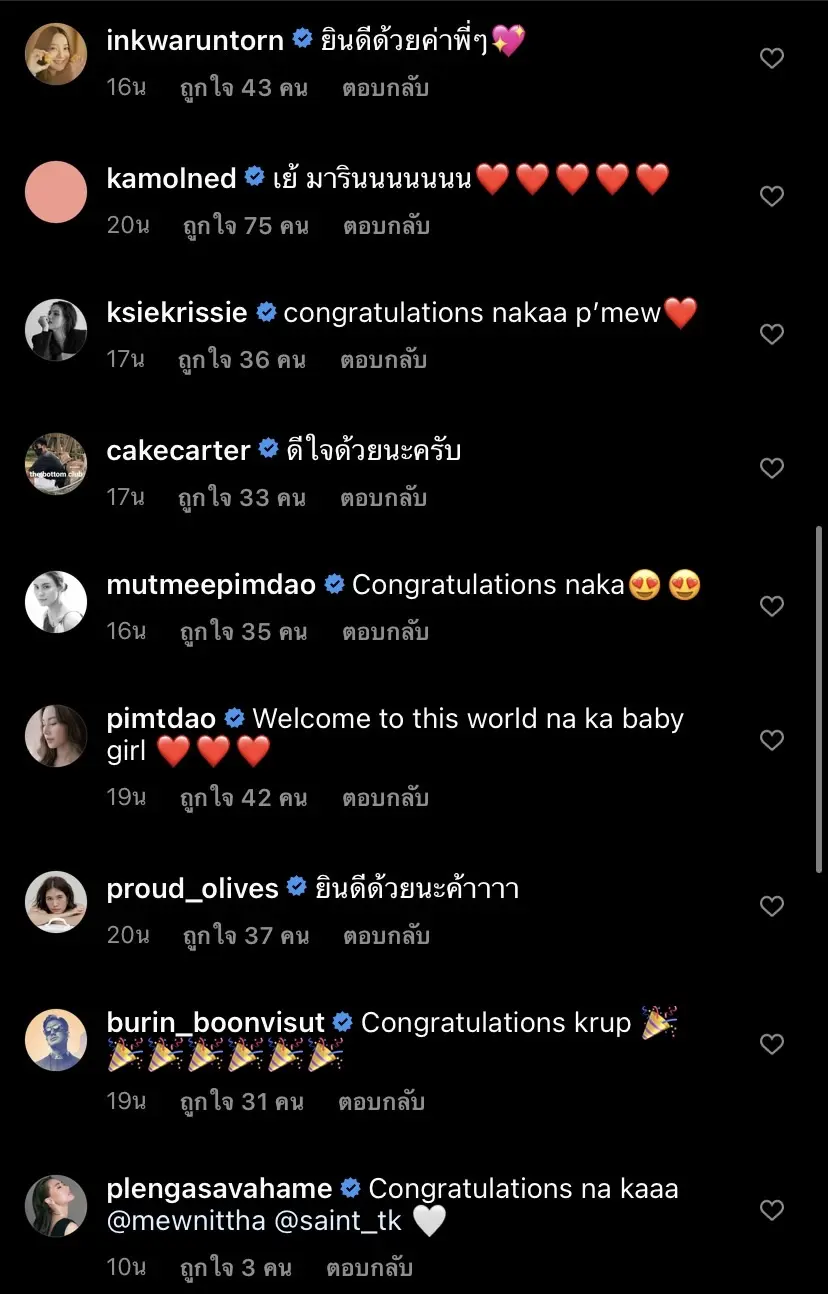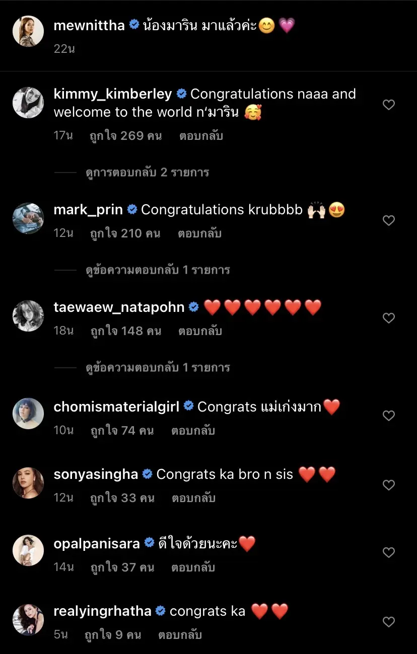 ล่าสุด ด้านอินสตาแกรมของ มิว นิษฐา ได้มีการโพสต์ภาพครอบครัวเป็นครั้งแรก พร้อมระบุข้อความว่า น้องมาริน มาแล้วค่ะ😊💗 ทำเอาเพื่อนๆร่วมวงการ รวมถึงแฟนคลับแห่แสดงความยินดีเป็นจำนวนมาก อีกทั้งหลายๆเสียงยังบอกอีกด้วยว่า น้องมาริน หน้าเหมือนคุณพ่อมากๆ