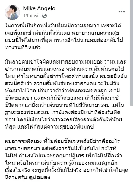 เป็นอีกหนึ่งเรื่องราวความประทับใจสำหรับ ไมค์ พิรัชต์ ที่ออกมาโพสต์เรื่องราวความสุขที่ได้อยู่กับลูกอย่าง “น้องแม็กซ์เวลล์” เพราะหลังจากที่ ซาร่า อดีตแฟนสาว ได้เปิดโอกาสให้พ่อ-ลูกได้พบเจอกัน แถมภาพความครัวสุดประทับใจ ก็กลับมาดูอบอุ่นอีกครั้ง ล่าสุด ไมค์ พิรัชต์ ออกมาโพสต์ข้อความว่า “ในภาพนี้เป็นอีกหนึ่งวันที่ผมมีความสุขมาก เพราะได้เจอพี่แมกซ์ เล่นกันทั้งวันเลย พยายามเก็บความสุขแบบนี้ให้ได้มากที่สุด เพราะอีกไม่นานผมต้องกลับไปทำงานที่จีนแล้ว มีหลายคนเข้าใจผิดและมาสอบถามผมเยอะ ว่าผมและซาร่ากลับมาดีกันแล้วเหรอ จะสานความสัมพันธ์ต่อใช่ไหม ทำไมทนายฝั่งซาร่าโพสต์ทำนองนั้น ผมขอยืนยันตรงนี้ครับว่า ความสัมพันธ์ของเราสองคน จะไม่มีวันพัฒนาไปไกล เกินกว่าคำว่าพ่อและแม่ของลูก เขามีชีวิตของเขา และผมก็มีชีวิตของผม ถ้าไม่มีพี่แมกซ์ ชีวิตพวกเรายิ่งกว่าเส้นขนานที่ไม่มีวันมาบรรจบ แต่ในฐานะของพ่อและแม่ เรายังคงต้องมีหน้าที่ต้องรับผิดชอบ โดยมีเงื่อนไขว่าเราจะคุยเรื่องส่วนตัวกันให้น้อยที่สุด และโฟกัสแต่ความสุขของพี่แมกซ์