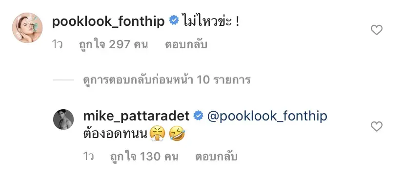 เพราะภาพที่เจ้าตัวโพสต์เป็นภาพที่ไมค์ออกกำลังกายและถอดเสื้อโชส์ซิคแพ็ค ที่บอกได้เลยว่าใครเห็นเป้นต้องกรี๊ดอย่างแน่นอน แต่ที่เรียกเสียงกรี๊ดได้ดีกว่าก็เป็นเพราะแปคชั่นของไมค์ ที่โพสต์ว่า “พี่ดุนะ หนูไหวหรอ” งานนี้เจ้าของตัวจริงอย่าง ปุ๊กลุก ถึงกับต้องออกโรงมาคอมเมนต์ด้วยตัวเองแบบแซ่บๆว่า “ไม่ไหวค่ะ” ทำเอาแฟนคลับฟินกันเลยทีเดียวค่าา