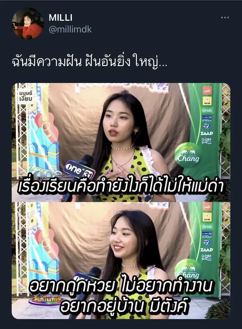 ล่าสุด เจ้าตัวได้มีการโพสต์ข้อความผ่านทวิตเตอร์ ระบุข้อความว่า “ฉันมีความฝัน ฝันอันยิ่งใหญ่…” พร้อมกับแชร์ภาพขณะที่กำลังให้สัมภาษณ์ด้วยวลีที่ว่า “เรื่องเรียนคือทำยังไงก็ได้ไม่ให้แม่ด่า อยากถูกหวย ไม่อยากทำงาน อยากอยู่บ้าน มีตังค์”งานนี้ทำเอาถูกอกถูกใจบรรดาแฟนคลับกันยกใหญ่ พร้อมกับขอมีมไปแชร์เพราะคำพูดของมิลลิมันช่างโดนใจซะเหลือเกิน