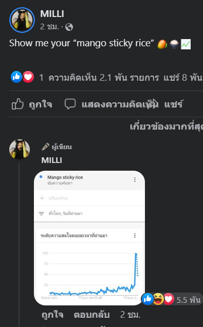 มิลลิ ยังคงฟีเวอร์! ล่าสุดคำค้นหา ข้าวเหนียวมะม่วง ภาษาอังกฤษ หรือ Mango sticky rice ในกูเกิ้ลพุ่งสูงขึ้นเป็นประวัติกาล หลังเจ้าตัวกินโชว์บนเวที โคเชลลา