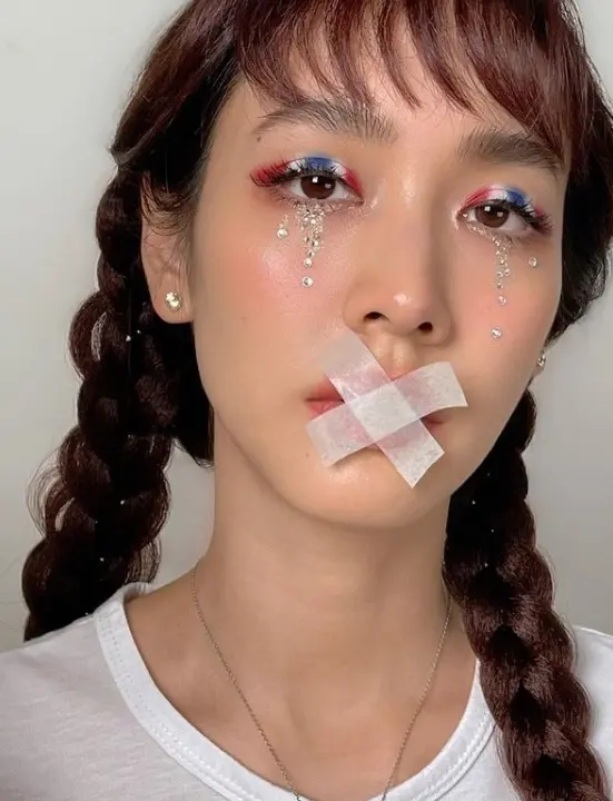 ด้วยการเมพอัพเปลือกตา เป็นสีธงชาติไทย ตกแต่งดีเทลเป็นน้ำตา แสดงให้เห็นว่ากำลังร้องไห้ บริเวณปากถูกแปะเป็นสัญลักษณ์กากบาท แสดงให้เห็นว่าประชาชนในตอนนี้กำลังถูกปิดปากจากรัฐบาล พร้อมแคปชั่นว่า “Freedom of speech” แปลเป็นไทยได้ว่า “เสรีภาพแห่งการพูด” ซึ่งก็ได้มีเพื่อนๆร่วมวงการ และ บรรดาแฟนคลับที่ติดตามต่างปรบมือกันรัวๆ เพราะ รู้สึกไม่ผิดหวังที่เป็นแฟนคลับของเธอ