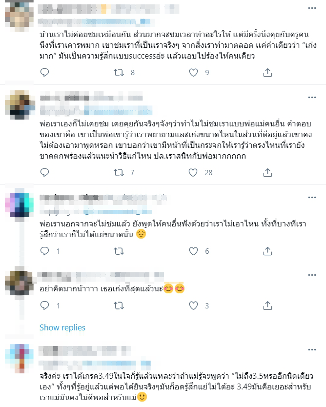 ซึ่งก็มีคนมารีทวิตต่ออย่างมากมาย ทั้งยังตอบด้วย เช่น “บ้านเรานอกจากจะไม่ชมแล้ว เวลาทำอะไรให้ไม่พอใจเช่นนี่นั่งเคลียร์งานอยู่แล้วเค้าใช้ไปหยิบของพอไม่หยิบให้ จะมีคำพูดมาทุกครั้งว่า “พึ่งพาไม่ได้เลย” ครั้งแรกที่ถูกชมคือจากเพื่อนมหาลัย ตอนได้ยินคือจะร้องไห้อะมันหนึบๆในใจ555″