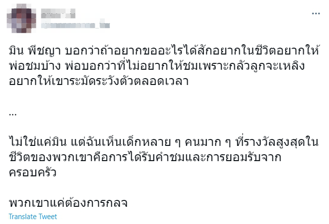 ไม่ใช่แค่มิน แต่ฉันเห็นเด็กหลาย ๆ คนมาก ๆ ที่รางวัลสูงสุดในชีวิตของพวกเขาคือการได้รับคำชมและการยอมรับจากครอบครัว