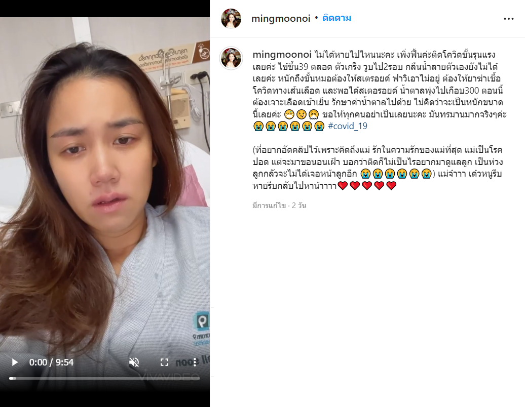 “ไม่ได้หายไปไหนนะคะ เพิ่งฟื้นค่ะ ติดโควิดขั้นรุนแรงเลยค่ะ ไข้ขึ้น 39 ตลอด ตัวเกร็ง วูบไป 2 รอบ กลืนน้ำลายตัวเองยังไม่ได้เลยค่ะ หนักถึงขั้นหมอต้องให้สเตียรอยด์ ฟาวิฯ เอาไม่อยู่ ต้องให้ยาฆ่าเชื้อโควิดทางเส้นเลือด และพอได้สเตียรอยด์ น้ำตาลพุ่งไปเกือบ 300 ตอนนี้ต้องเจาะเลือดเช้าเย็น รักษาค่าน้ำตาลไปด้วย ไม่คิดว่าจะเป็นหนักขนาดนี้เลยค่ะ ขอให้ทุกคนอย่าเป็นเลยนะคะ มันทรมานมากจริง ๆ ค่ะ”