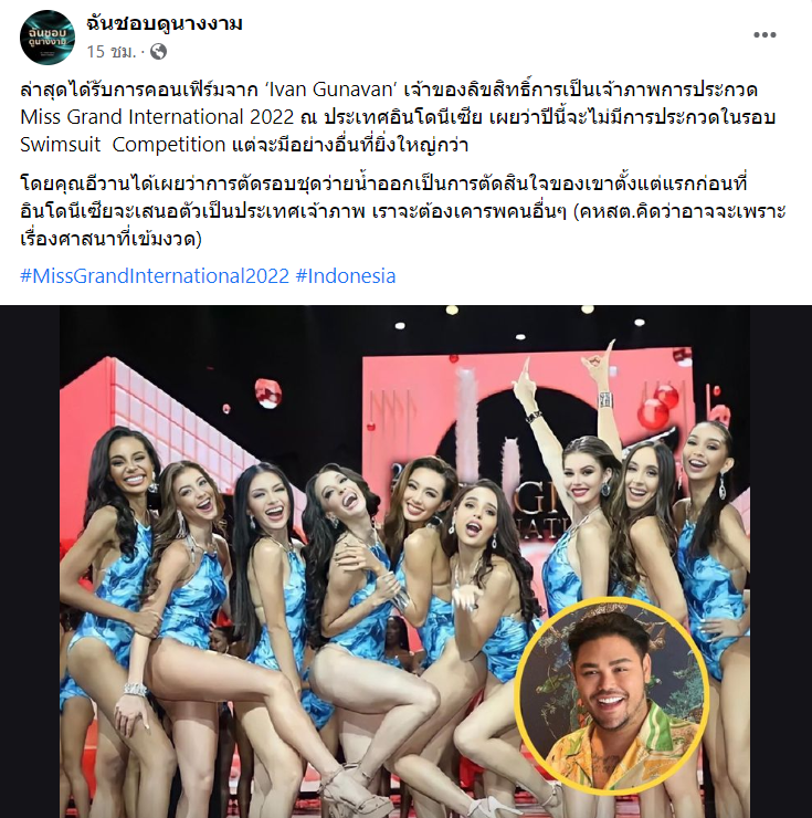 “ล่าสุดได้รับการคอนเฟิร์มจาก Ivan Gunavan เจ้าของลิขสิทธิ์การเป็นเจ้าภาพการประกวด Miss Grand International 2022 ณ ประเทศอินโดนีเซีย เผยว่าปีนี้จะไม่มีการประกวดในรอบ Swimsuit Competition แต่จะมีอย่างอื่นที่ยิ่งใหญ่กว่า”