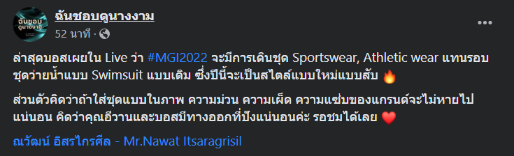 ล่าสุด เพจ ฉันชอบดูนางงาม ได้เปิดเผยข้อมูลเพิ่มเติมว่า “บอสณวัฒน์เผยใน Live ว่า #MGI2022 จะมีการเดินชุด Sportswear, Athletic wear แทนรอบชุดว่ายน้ำ ซึ่งปีนี้จะเป็นสไตล์แบบใหม่แบบสับ ส่วนตัวคิดว่าถ้าใส่ชุดแบบในภาพ ความม่วน ความเผ็ด ความแซ่บของแกรนด์จะไม่หายไปแน่นอน คิดว่าคุณอีวานและบอสมีทางออกที่ปังแน่นอนค่ะ รอชมได้เลย”