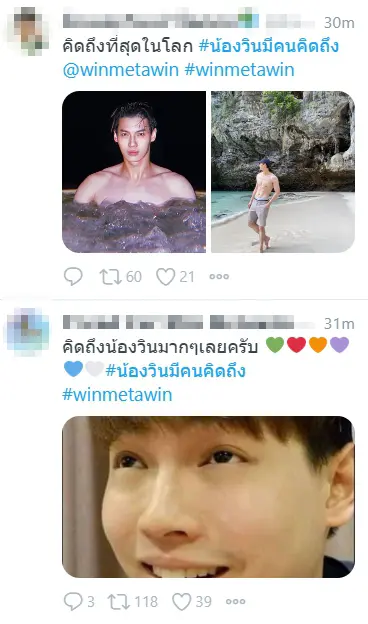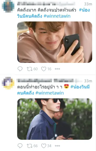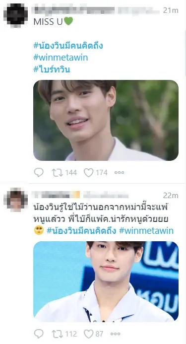 โดยในแฮชแท็ก #น้องวินมีคนคิดถึง นั้น ทั้งเหล่าแฟนไทย และต่างชาติ ต่างก็พากันมาแปะรูปน่ารักๆ ของน้องวิน ร่วมถึงเขียนทวิตบอกต่อความคิดถึงกันยกใหญ่ เห็นแฟนๆ ต่างก็บ่นคิดถึงคนเก่งกันเสียขนาดนี้ แอบถามน้องวินนิดนึงว่า จะมาทักทายกันให้หายคิดถึงกันบ้างรึเปล่าเอ่ย