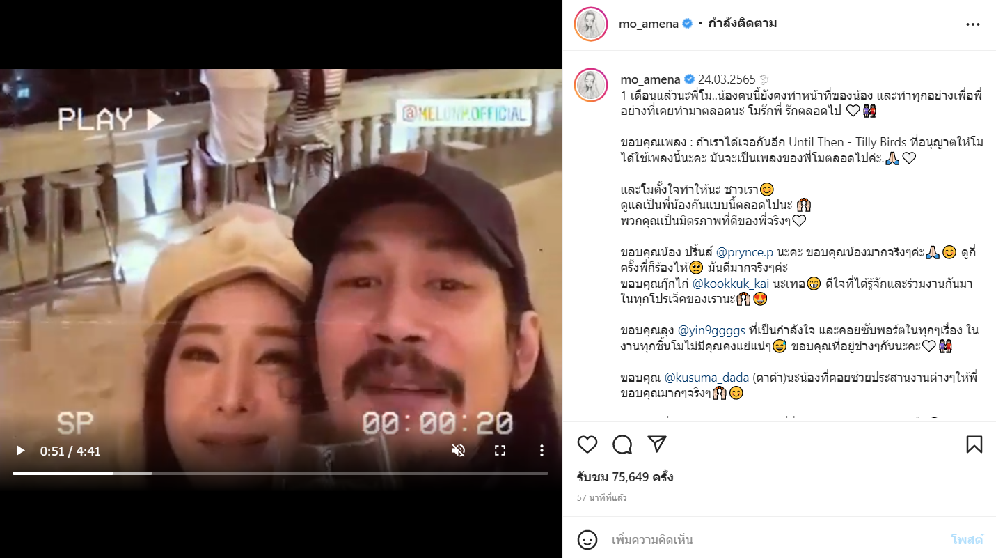 โดย โม อมีนา ยังเผยความในใจผ่านทางแคปชั่นอีกด้วยว่า ‘1 เดือนแล้วนะพี่โม…น้องคนนี้ยังคงทำหน้าที่ของน้อง และทำทุกอย่างเพื่อพี่อย่างที่เคยทำมาตลอดนะ โมรักพี่ รักตลอดไป ขอบคุณเพลง ถ้าเราได้เจอกันอีก ที่อนุญาตให้โมได้ใช้เพลงนี้นะคะ มันจะเป็นเพลงของพี่โมตลอดไปค่ะ’