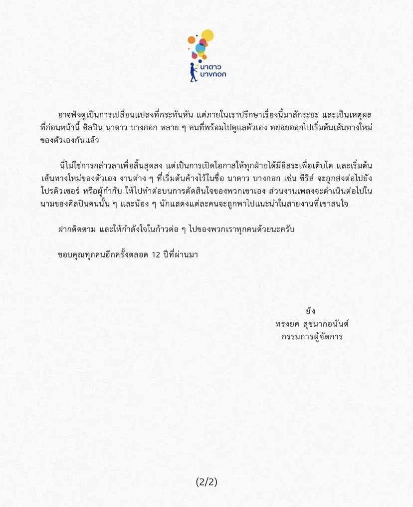 จากกรณีที่ นาดาว บางกอก ออกมาร่อนจดหมายยุติบทบาทการเป็นบริษัทพัฒนาและดูแลศิลปิน รวมถึงการเป็นผู้ผลิตซีรีส์ ละคร หรือผลงานเพลงต่างๆ สร้างความใจหายกับบรรดาแฟนๆไม่น้อย โดยเนื้อหาในจดหมายระบุว่า