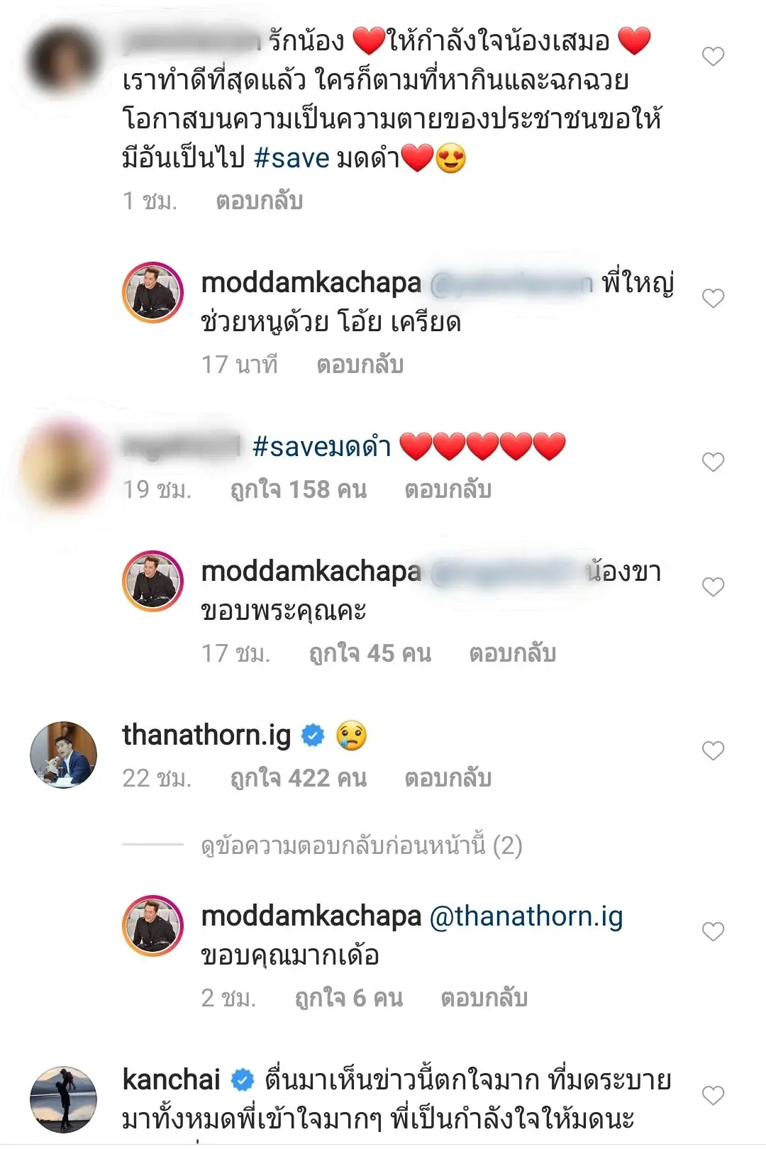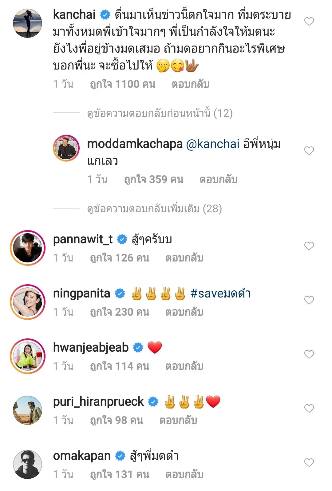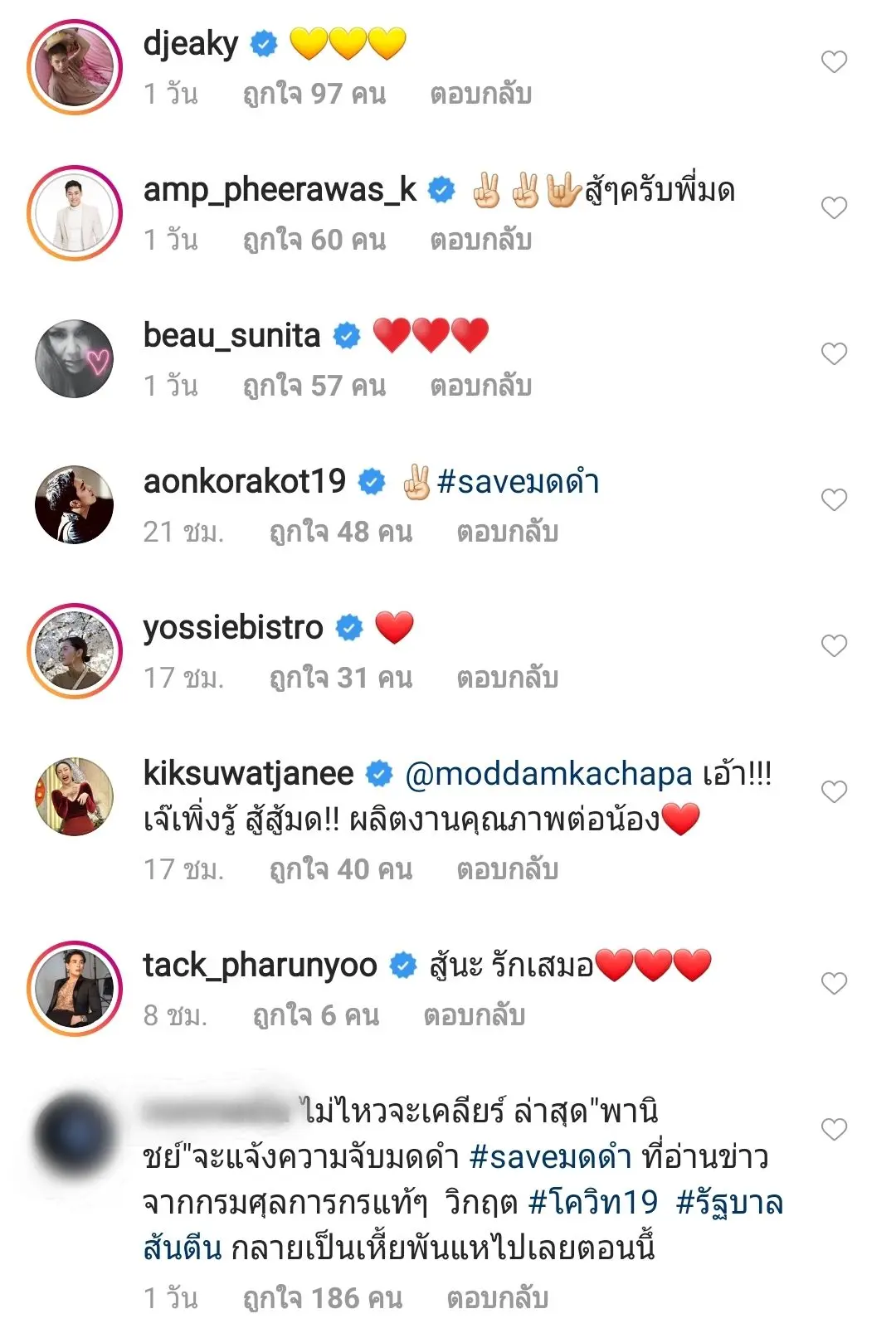 ซึ่งเมื่อเจ้าตัวโพสต์ลงไปในอินสตาแกรมก็มีเพื่อนๆในหลากหลายวงการ และแฟนๆเข้ามาส่งกำลังใจให้ มดดำ มากมาย ซึ่งประเด็นดังกล่าวก็ทำเอาแฮชแท็ก #saveมดดำ ติดเทรนด์ยอดนิยมในทวิตเตอร์ทันทีค๊าาา