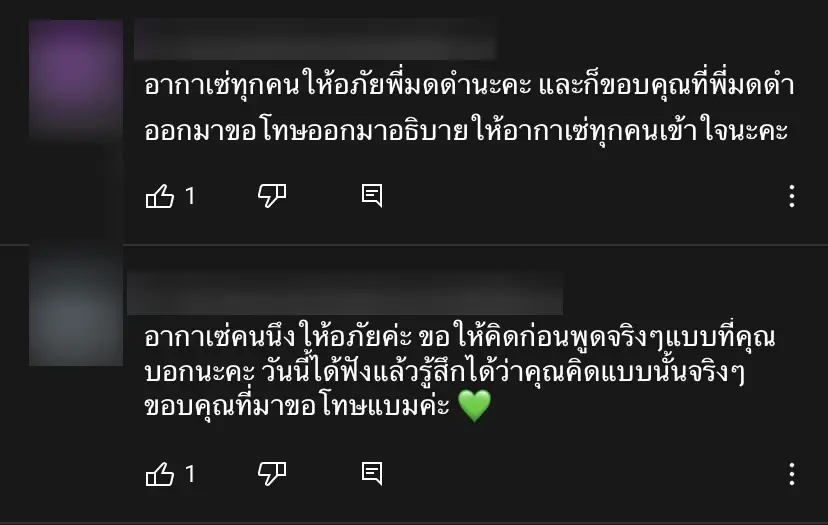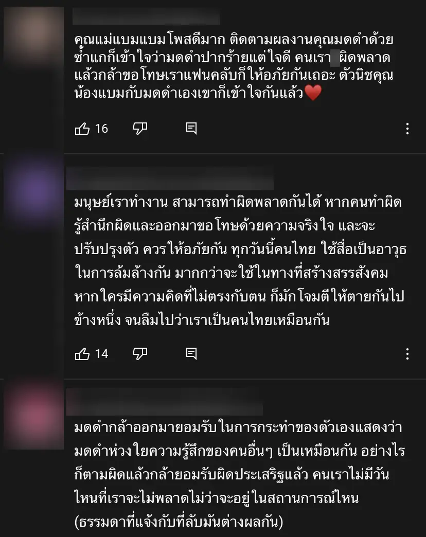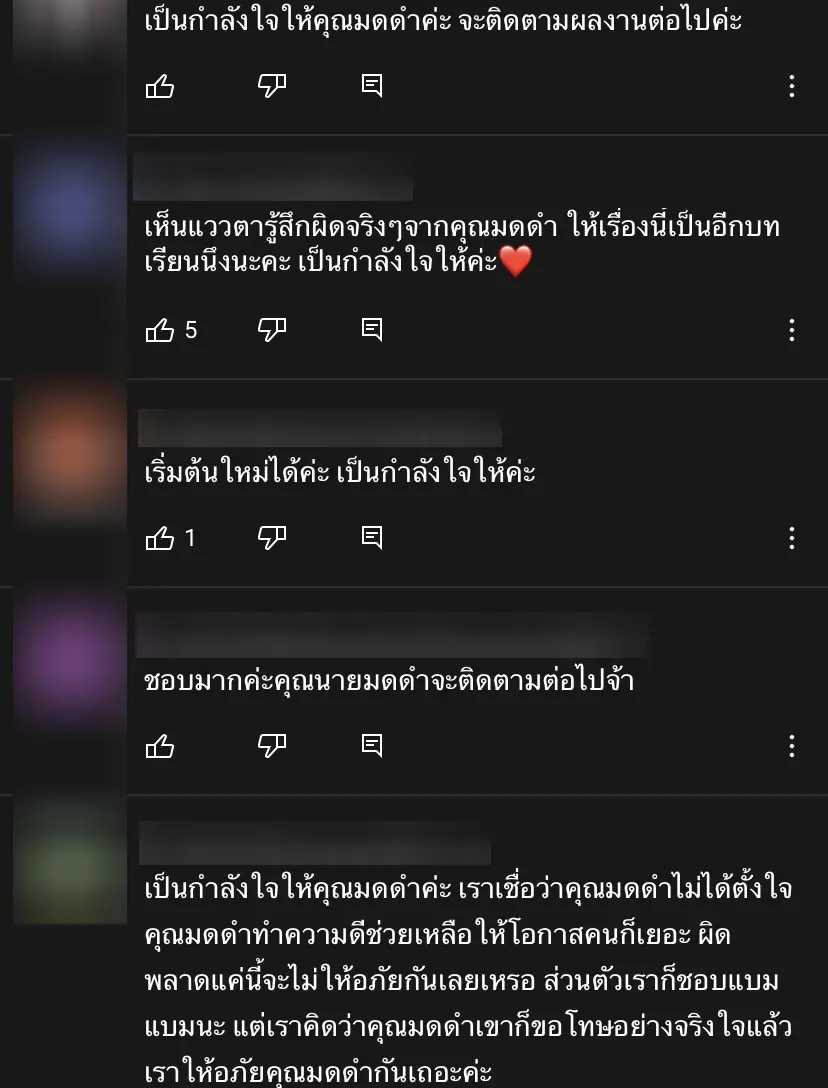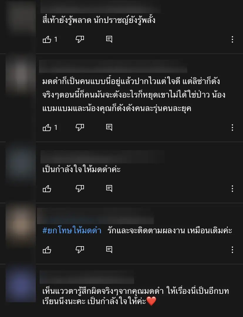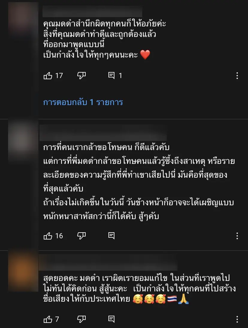 ล่าสุด ด้านชาวเน็ตต่างออกมากระหน่ำส่งข้อความถึง มดดำ เป็นจำนวนมาก โดยส่วนใหญ่ได้มีการรับคำขอโทษของ มดดำ อีกทั้งยังส่งกำลังใจให้ มดดำ พร้อมกับบอกอีกด้วยว่า คนเราผิดพลาดกันได้ และ เกรงว่า มดดำ จะหลุดคาแรคเตอร์เดิม