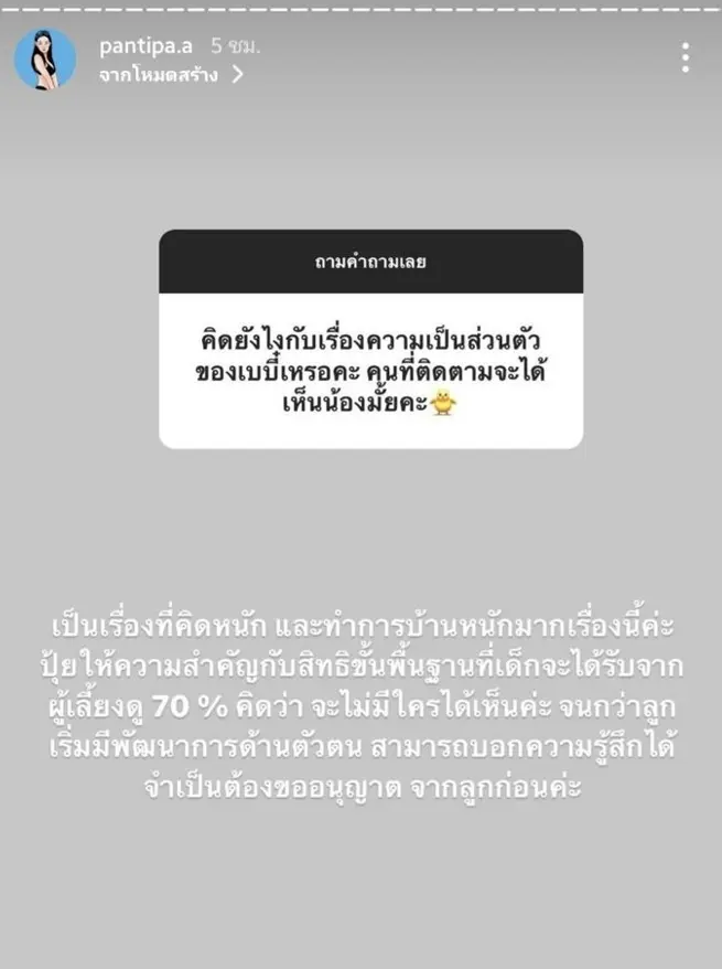 อย่างไรก็ตามหากย้อนกลับไปเมื่อช่วงเดือนตุลาคม ปี 2564 ก่อนที่ ปุ้มปุ้ย พรรณทิพา จะคลอดลูกชาย เธอเคยออกมาตอบกลับแฟนคลับผ่าน Instagram หลังได้ร่วมส่งข้อความผ่านอินสตาแกรมสตอรี่ในประเด็น คิดยังไงกับเรื่องความเป็นส่วนตัวของเบบี๋เหรอคะ คนที่ติดตามจะได้เห็นน้องไหมคะ? งานนี้เธอได้หงายทัศนคติแบบสุดปังตอบกลับไปอย่างชัดเจนว่า