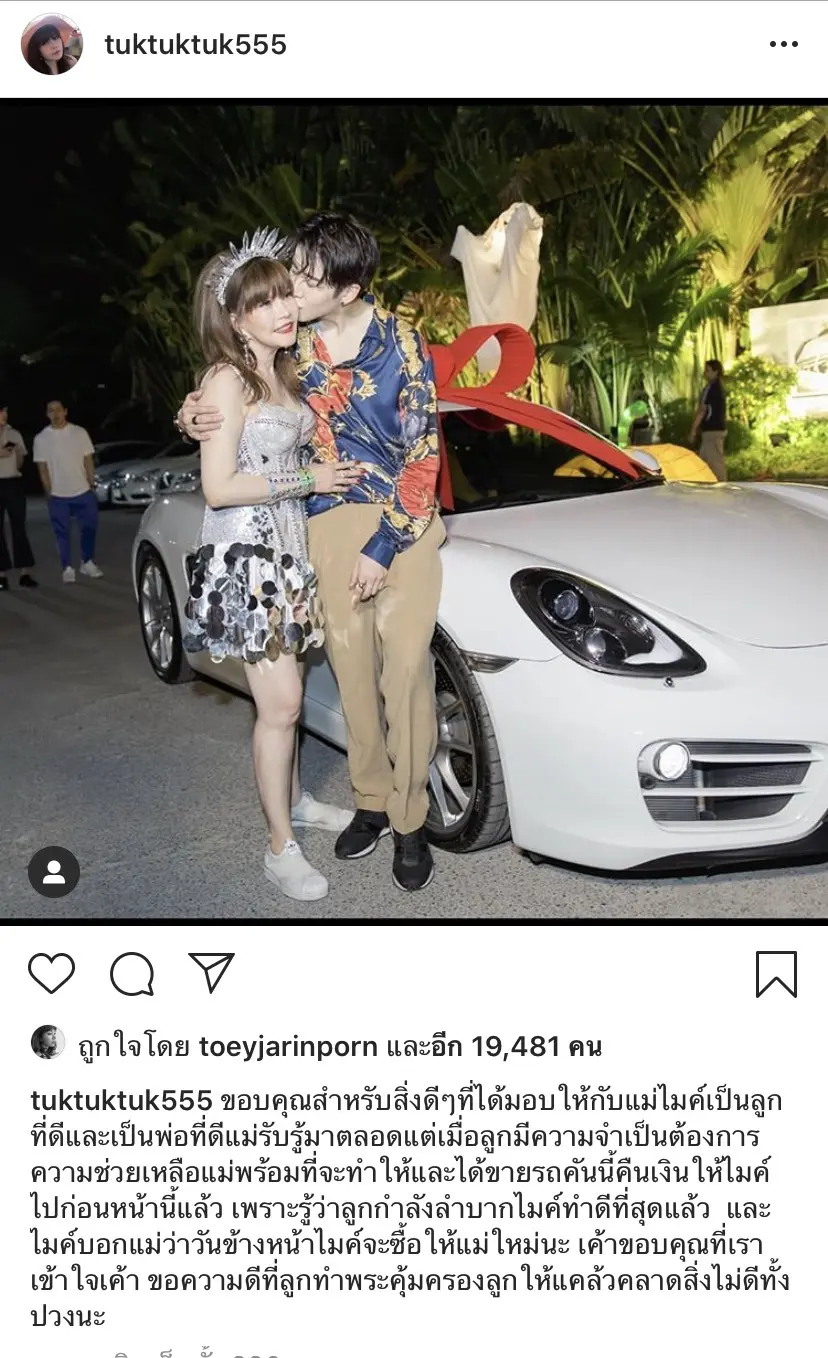 ต่อมา “แม่ตุ๊ก ปราศัย นิธิไพศาลกุล” แม่ของ ไมค์ พิรัชต์ ได้ออกมาโพสต์ข้อความว่า “ขอบคุณสำหรับสิ่งดีๆที่ได้มอบให้กับแม่ไมค์เป็นลูกที่ดีและเป็นพ่อที่ดีแม่รับรู้มาตลอดแต่เมื่อลูกมีความจำเป็นต้องการความช่วยเหลือแม่พร้อมที่จะทำให้และได้ขายรถคันนี้คืนเงินให้ไมค์ไปก่อนหน้านี้แล้ว เพราะรู้ว่าลูกกำลังลำบากไมค์ทำดีที่สุดแล้ว และไมค์บอกแม่ว่าวันข้างหน้าไมค์จะซื้อให้แม่ใหม่นะ เค้าขอบคุณที่เราเข้าใจเค้า ขอความดีที่ลูกทำพระคุ้มครองลูกให้แคล้วคลาดสิ่งไม่ดีทั้งปวงนะ”