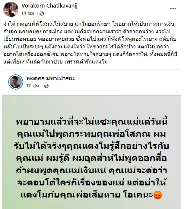 ล่าสุดด้าน คุณแม่แต๊งค์ ก็ได้ออกมาเคลื่อนไหวเฉกเช่นเดียวกันผ่านเฟซบุ๊กส่วนตัวของเธอ พร้อมกับเผยเรื่องราวของพ่อโส ถึงวันวานในอดีตที่เคยร่วมพูดคุยกันผ่านการแชร์โพสต์ของลูกชายว่า