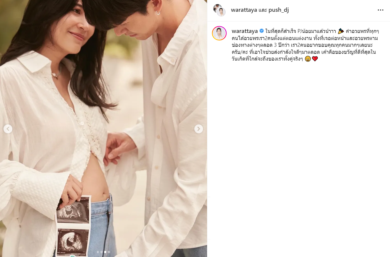 โดยในอินสตาแกรมส่วนตัวของทั้งคู่ระบุว่า “ในที่สุดก็สำเร็จ PJ น้อยมาแล้วนะ คำอวยพรที่ทุก ๆ คนได้อวยพรเรา 2 คนตั้งแต่ตอนแต่งงาน ทั้งที่เจอต่อหน้าและอวยพรตามช่องทางต่าง ๆ ตลอด 3 ปีกว่า เรา 2 คนอยากขอบคุณทุกคนมาก ๆ เลยนะครับ/ค่ะ ที่เอาใจช่วยส่งกำลังใจดี ๆ มาตลอด เขาคือของขวัญที่ดีที่สุดในวันเกิดที่ใกล้จะถึงของเราทั้งคู่จริง ๆ”