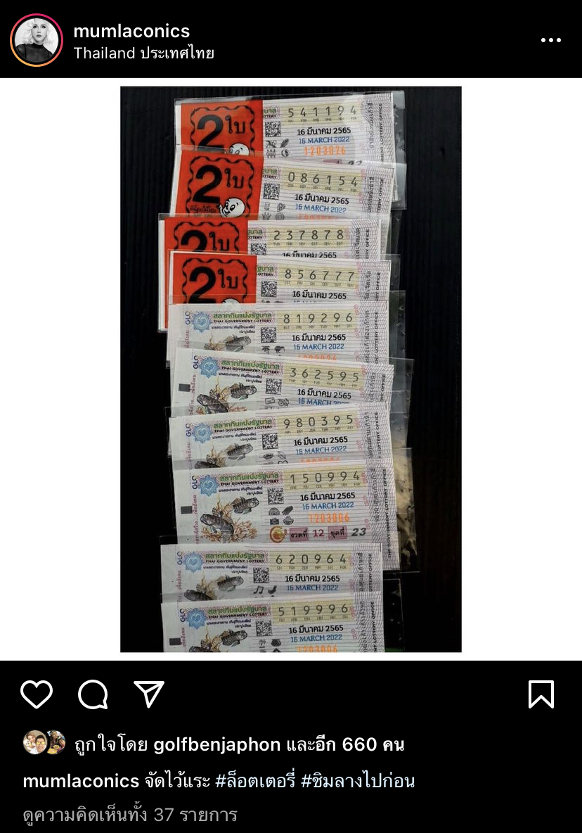 มัม ลาโคนิค เปิดภาพลอตเตอรี่งวดล่าสุดตั้งแต่ต้นเดือน จัดไปหนัก ๆ 10 ชุด! ด้านคอหวยที่ติดตามแห่เข้าไปดู ขอตามเลขงวดนี้!