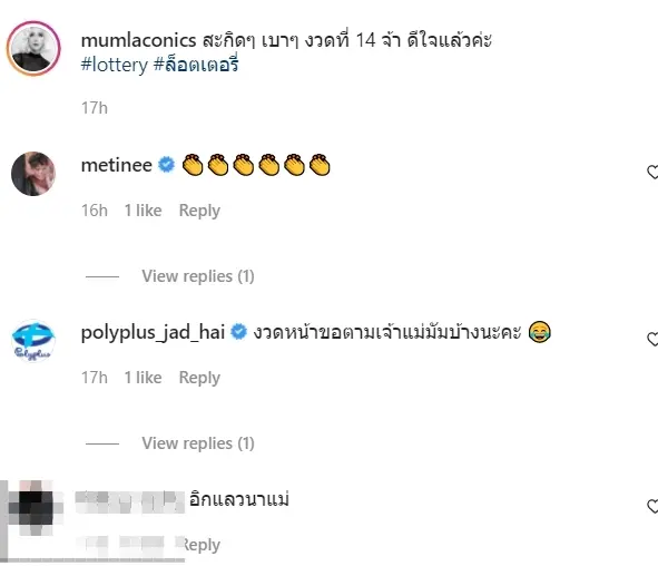 อีกทั้งเธอยังออกมาเขียนข้อความในไอจีพร้อมแจ้งข่าวไว้อีกว่า สะกิดๆ เบาๆ งวดที่ 14 จ้า ดีใจแล้วค่ะ #lottery #ล็อตเตอรี่