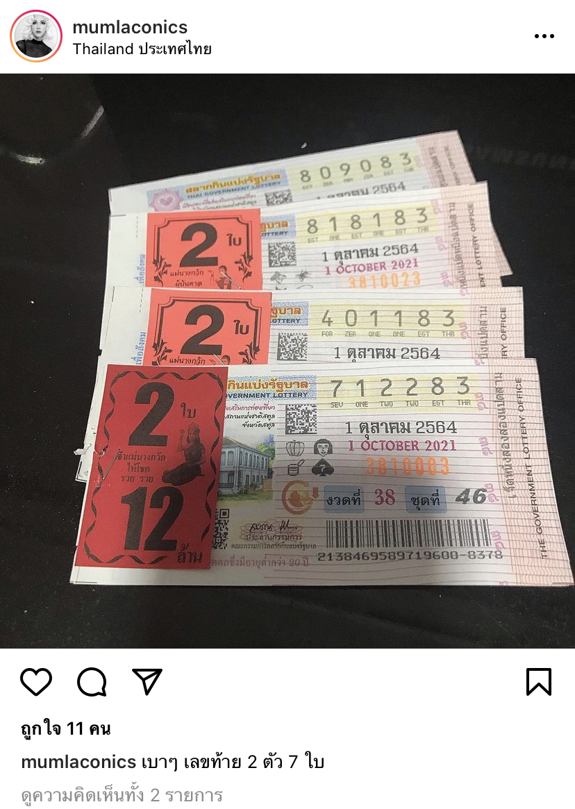 ล่าสุดในงวดวันที่ 1 ตุลาคม 2564 เจ้าตัวก็ได้ออกมาโชว์ลอตเตอรี่ถูกรางวัลเลขท้าย2ตัว 83 ถึง7ใบ งานนี้บอกเลยว่า เบาๆ จนมีหลายๆคนเข้าไปคอมเมนต์แสดงความยินดีพร้อมกับอิจฉาเจ้าตัวที่ถูกติดๆกันมาหลายงวดแล้ว