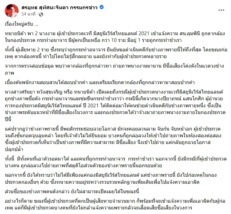 เรื่องราวใหญ่ที่สุดตั้งเริ่มมีการประกวด Miss Universe Thailand 2021 ในตอนนี้คงหนีไม่พ้นเรื่องของการที่มีคนออกมาแฉว่า ได้มีช่างภาพที่ร่วมงานกับทางกองประกวด ทำการกระทำชำเรา และ ข่มขืน ผู้เข้าประกวด แถมยังเป็นช่างภาพที่มีชื่อเสียงอีกด้วย