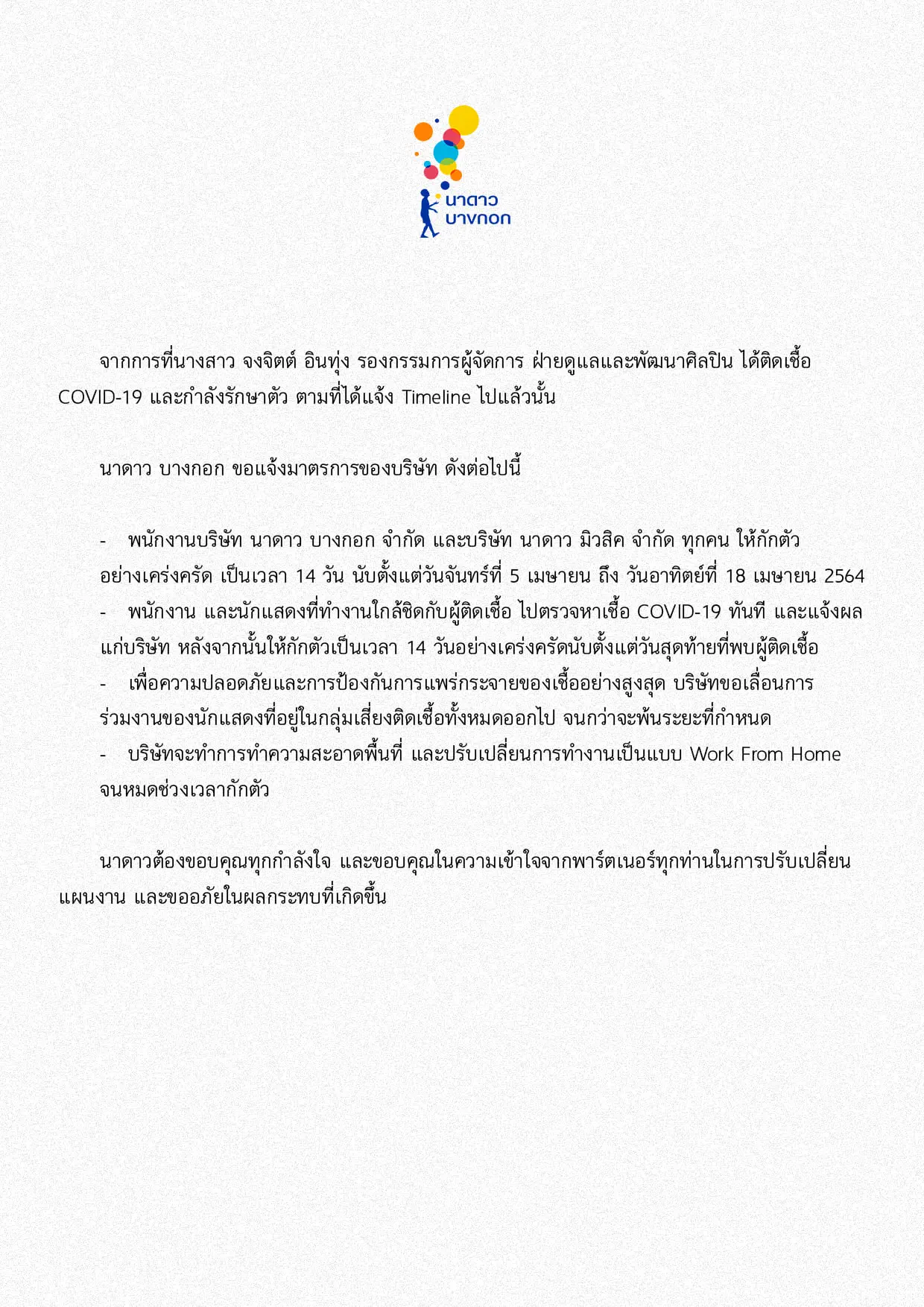 จากการที่นางสาว จงจิตต์ อินทุ่ง รองกรรมการผู้จัดการ ฝ่ายดูแลและพัฒนาศิลปิน ได้ติดเชื้อ COVID-19 และกำลังรักษาตัว ตามที่ได้แจ้ง Timeline ไปแล้วนั้น