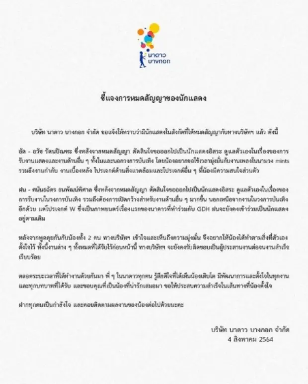 นาดาวบางกอก ออกมาประกาศชี้แจง เรื่องการหมดสัญญาของ อัด อวัช รัตนปิณฑะ และ ฝน ศนันธฉัตร ธนพัฒน์พิศาลโดยทั้งคู่ก็ได้เป็นนักแสดงอิสระแล้ว