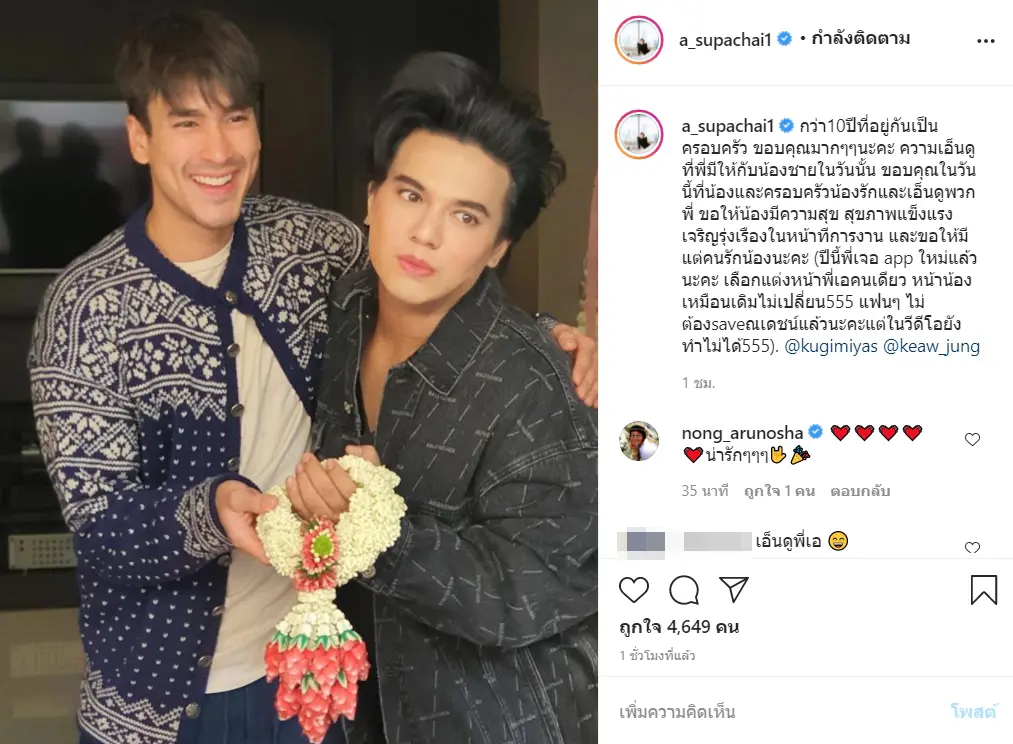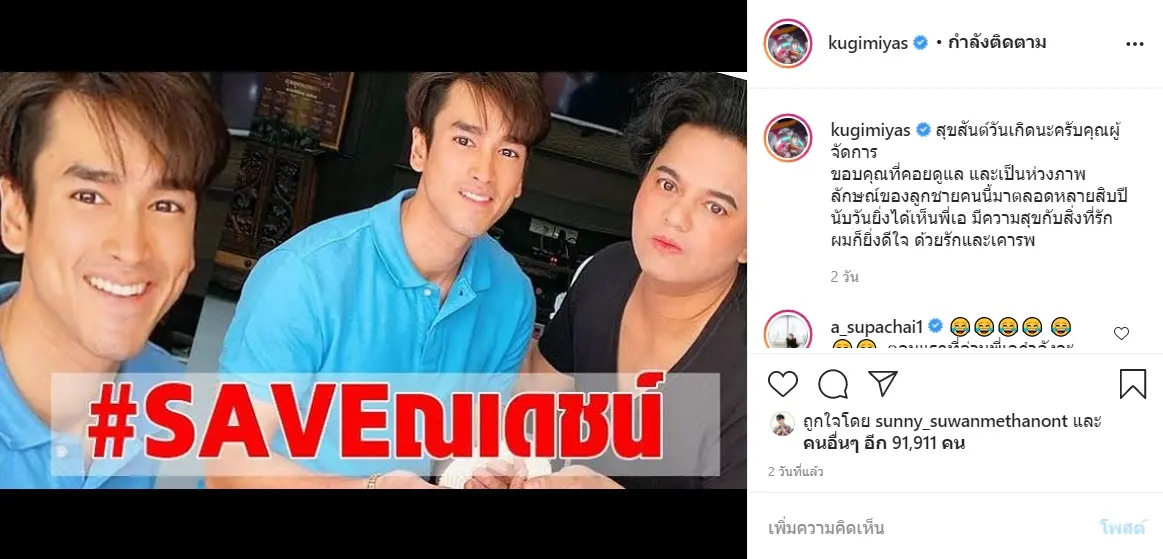 ‘กว่า10ปีที่อยู่กันเป็นครอบครัว ขอบคุณมากๆๆนะคะ ความเอ็นดูที่พี่มีให้กับน้องชายในวันนั้น ขอบคุณในวันนี้ที่น้องและครอบครัวน้องรักและเอ็นดูพวกพี่ ขอให้น้องมีความสุข สุขภาพแข็งแรง เจริญรุ่งเรืองในหน้าทีการงาน และขอให้มีแต่คนรักน้องนะคะ (ปีนี้พี่เจอ app ใหม่แล้วนะคะ เลือกแต่งหน้าพี่เอคนเดียว หน้าน้องเหมือนเดิมไม่เปลี่ยน555 แฟนๆ ไม่ต้องsaveณเดชน์แล้วนะคะแต่ในวีดีโอยังทำไม่ได้555). @kugimiyas @keaw_jung’