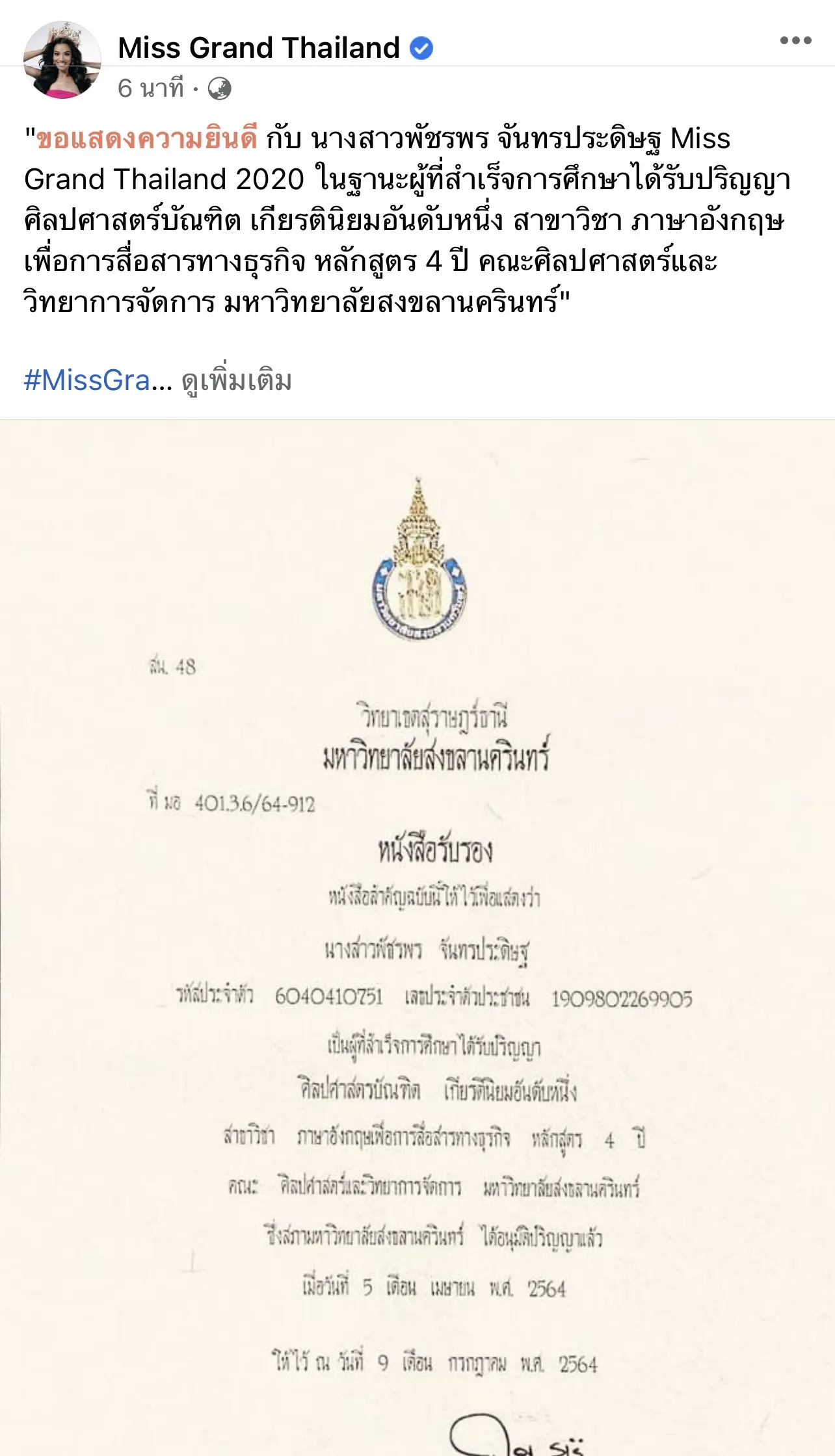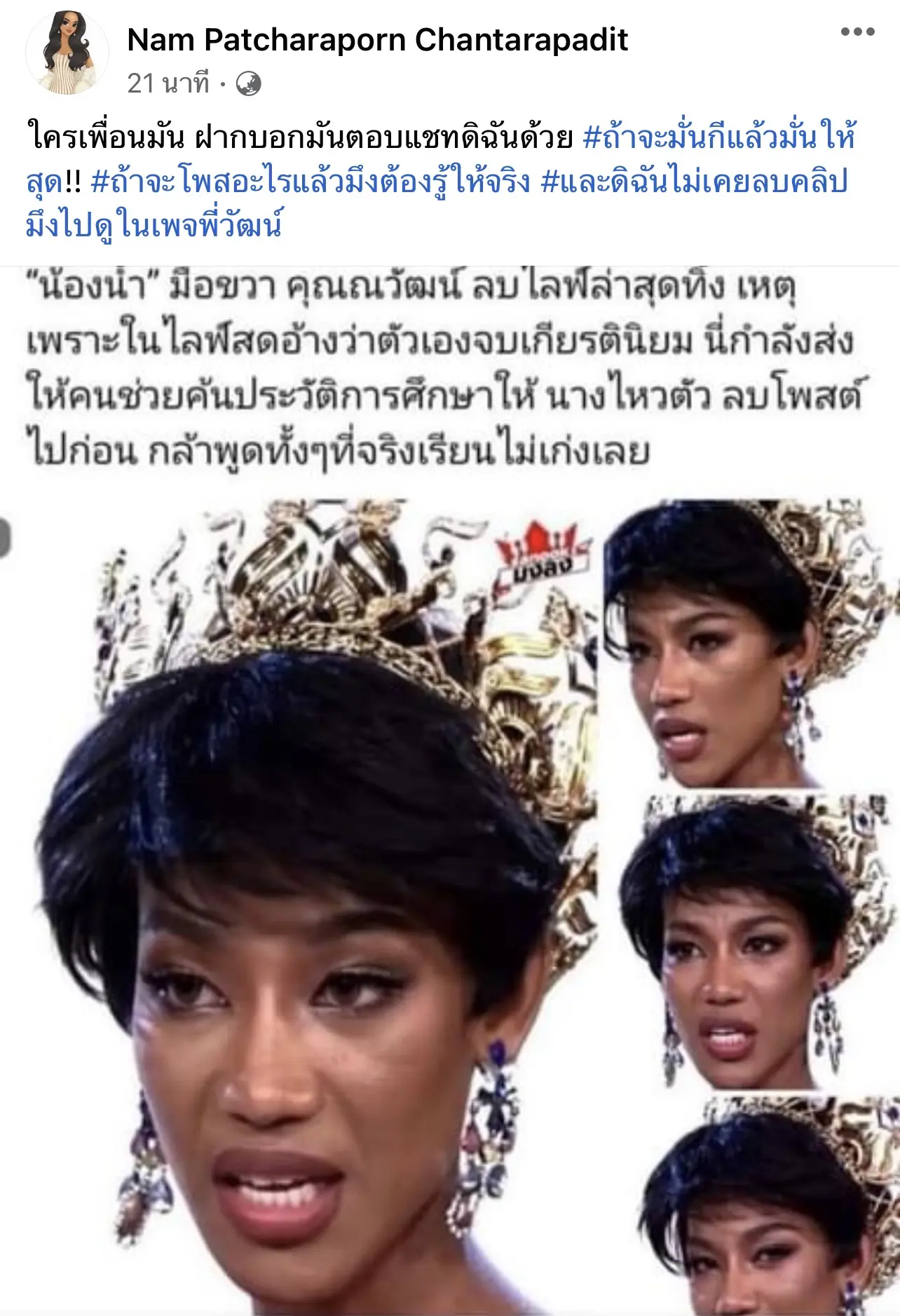 น้ำ พัชรพร เจ้าของตำแหน่งมิสแกรนด์ไทยแลนด์ 2020 ออกฟาดอีกหนึ่งแมต หลังเจอชาวเน็ตรายนึ่งโพสต์เรื่องการศึกษา เจ้าตัวลั่น รู้ไม่จริงอย่างพูด
