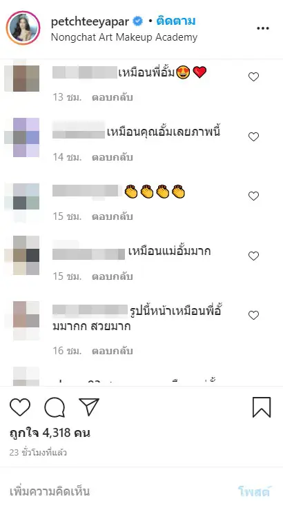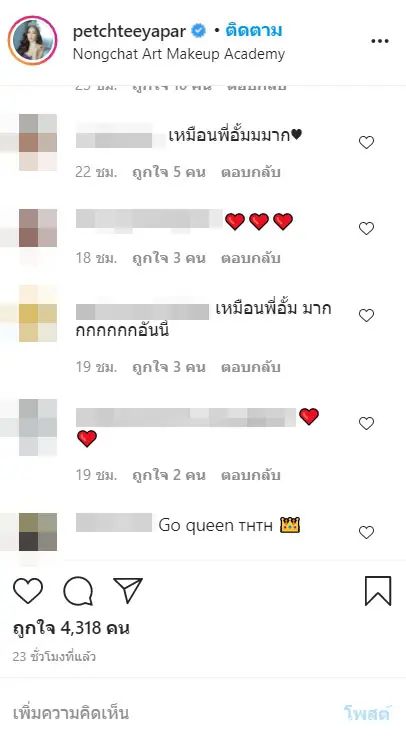 โดยคราวนี้สาวน้ำเพชรก็ได้สานฝันตนเอง หลังจากอัพหน้าใหม่โครงแม่อั้มไปแล้ว ก็ได้เมคอัพอาร์ตติสมือทองอย่างน้องฉัตร ช่างแต่งหน้าเดียวกับสาวอั้ม พัชราภา มาเนรมิตลุคแม่ให้ ซึ่งเมื่อสาวน้ำเพชรได้โพสต์ภาพพร้อมแคปชั่น ‘สมใจอยากซักทีน้อเรา ฟาดหน้าโดย พี่น้องฉัตร ช่างแต่งหน้าแม่อั้ม ขอบคุณพี่น้องฉัตรมากๆนะคะ ที่เสกให้ฝันหนูเป็นจริง #รักแม่อั้ม‘ แล้ว เหล่าแฟน ๆ ก็ได้คอมเมนต์ยืนยันว่าเหมือนสาวอั้มจริง ๆ นะ เช่น ‘เหมือน อั้ม เลยรูปนี้’ ‘เหมือนพี่อั้มมมาก♥️’ ‘เหมือนพี่อั้ม มากกกกกกกอันนี้’ ‘❤️❤️❤️ สวยมากกครับ พี่อั้มมสุดๆ’ ‘อั้มพัชมาก’ ‘เหมือนพี่อั้ม?❤️’