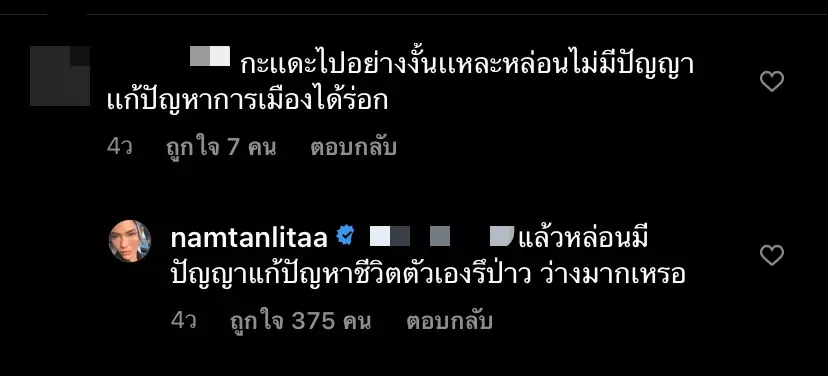 ล่าสุด เจ้าตัวได้มีการโพสต์ภาพโปรโมทที่เจ้าตัวได้สร้างผลงานการเป็นผู้กำกับครั้งแรก แต่ดันมีชาวเน็ตไม่ประสงค์ดีรายหนึ่งเข้ามาคอมเมนต์ว่า “กะเเดะไปอย่างงั้นเเหละหล่อนไม่มีปัญญาเเก้ปัญหาการเมืองได้หรอก” ซึ่งเจ้าตัวก็ไม่ได้อยู่เฉย เข้ามาตอบกลับชาวเน็ตคนดังกล่าวทันทีว่า “แล้วหล่อนมีปัญญาแก้ปัญหาชีวิตตัวเองรึป่าว ว่างมากเหรอ”