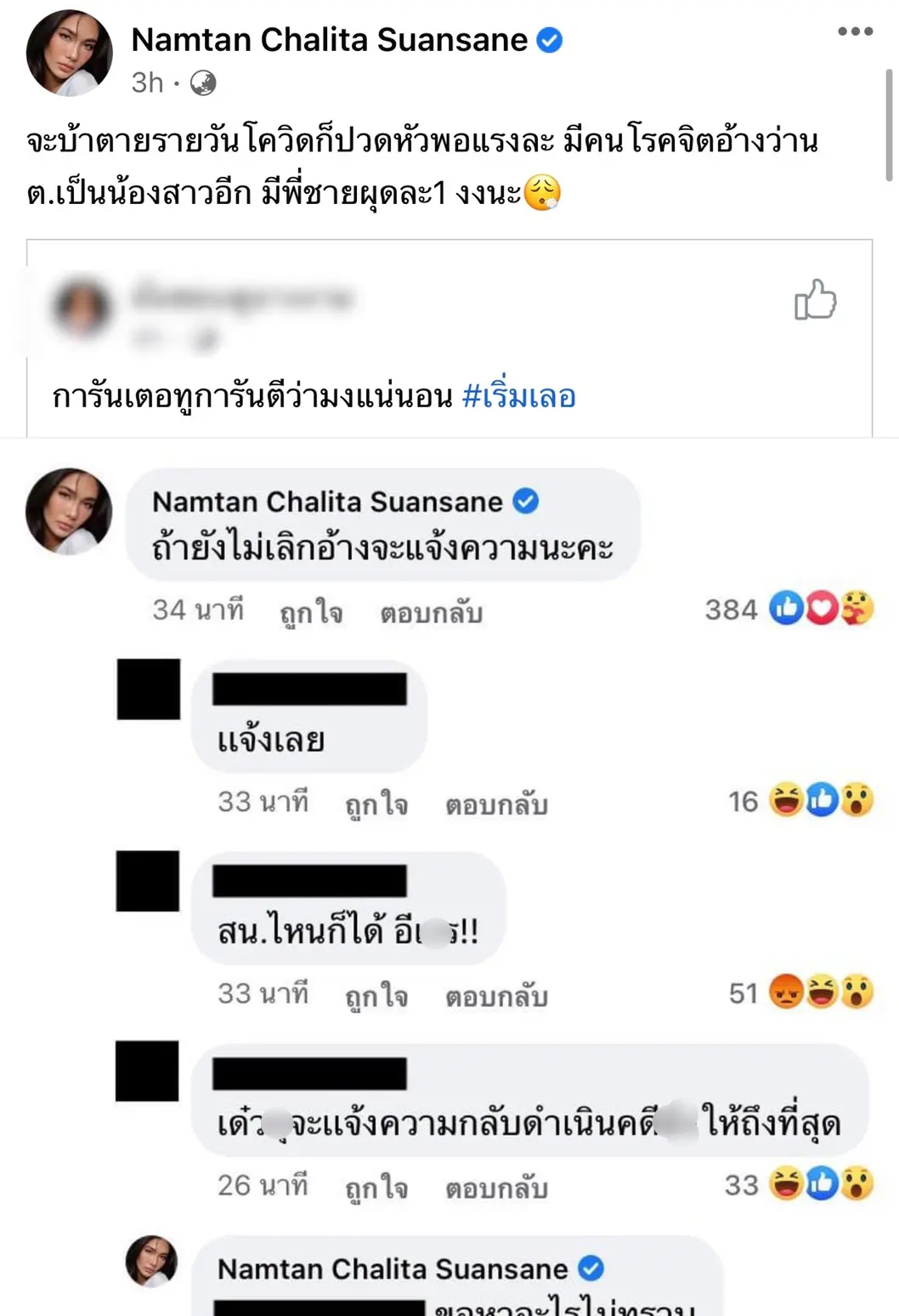 แต่เรื่องก็ยังไม่จบแค่นั้น น้ำตาล ได้ออกมาแชร์โพสต์ที่ชาวเน็ตถ่ายภาพหน้าจอของเขาและชาวเน็ตที่กำลังเมนต์ใส่กันอย่างไฟลุก ว่า “จะบ้าตายรายวัน โควิดก็ปวดหัวพอแรงละ มีคนโรคจิตอ้างว่าน้ำตาลเป็นน้องสาวอีก มีพี่ชายผุดละ1 งงนะ”