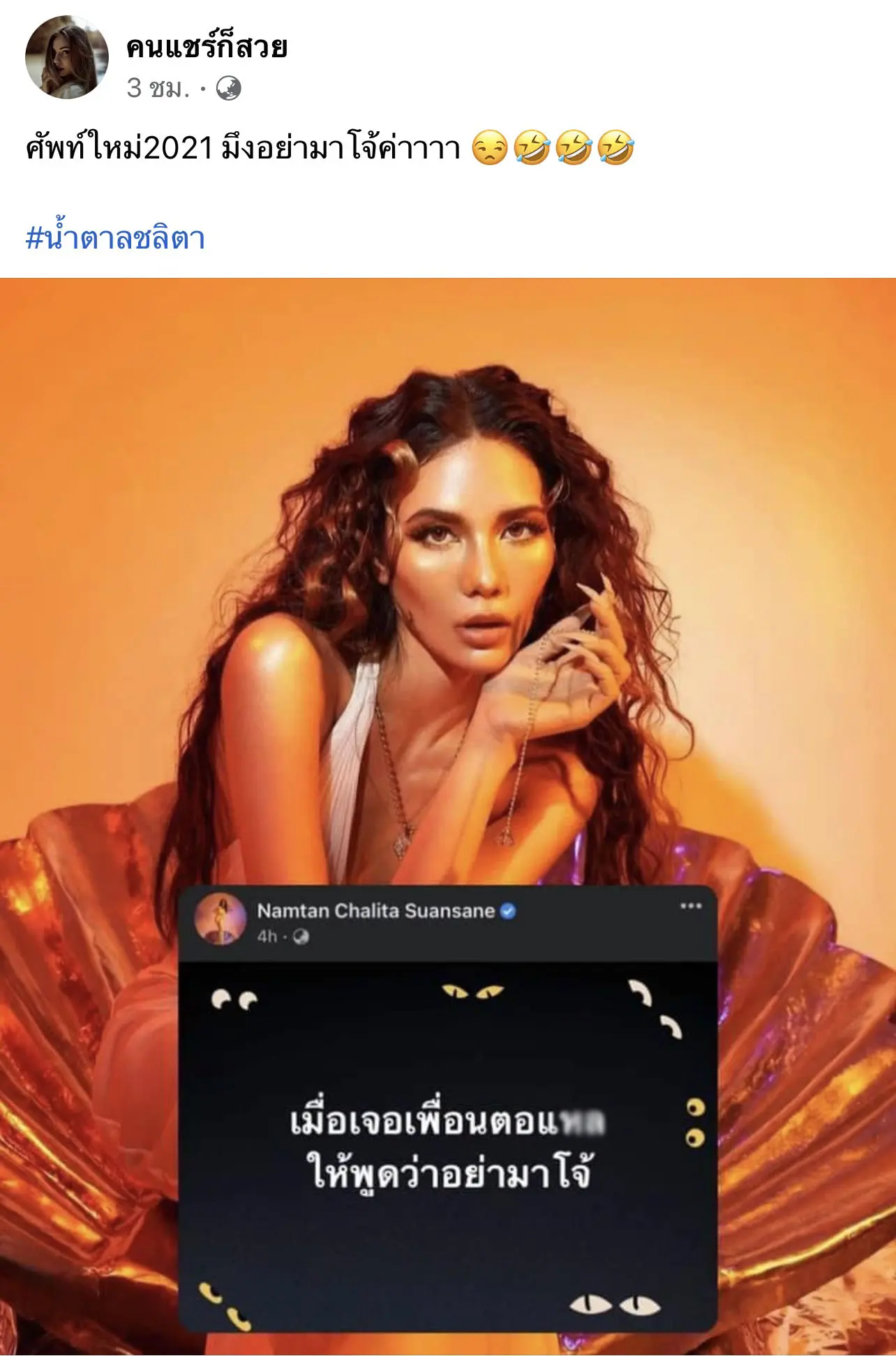 น้ำตาล ชลิตา ได้ออกมาโพสต์สเตตัสในทวิตเตอร์เเบบฟาดๆ ว่า “เมื่อเจอเพื่อนตอแห_ ให้พูดว่าอย่ามาโจ้” ทำเอาโลกออนไลน์ฮือฮาไม่น้อยกับศัพย์ใหม่ของเธอในครั้งนี้
