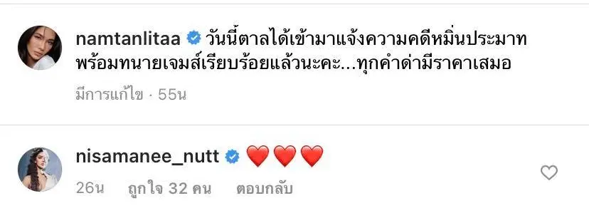 ส่วนเพื่อนๆในวงการก็ออกเเสดงความเห็นกับเป็นอย่างมาก โดยเฉพาะ นัท นิสามณี ที่เจ้าตัวก็เพิ่งจะได้ทำร่วมน้ำตาลเเละบังเอิญเพิ่งเข้าเเจ้งความข้อหาหมิ่นประมาทไปก่อนหน้านี้ ก็ออกมาคอมเม้น์กดหัวใจรัวๆใต้โพสต์ของสาวน้ำตาล งานนี้ก็มีเเรงเชียร์ให้สาวน้ำตาลอย่ายอมความเด็ดขาด คนพวกนั้นจะได้รู้ซะบ้างว่าอย่ามารองดีกับเเม่