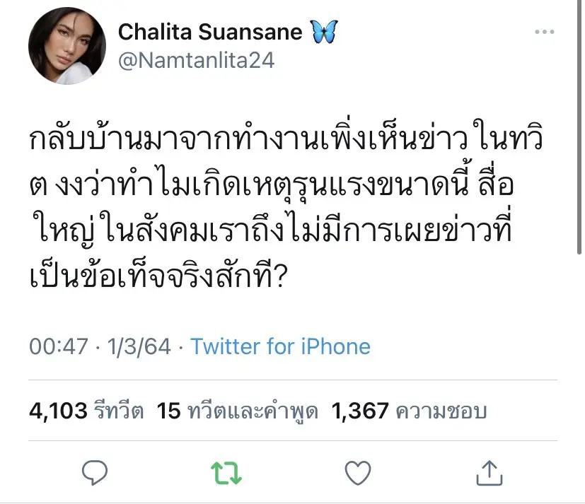 “กลับบ้านมาจากทำงานเพิ่งเห็นข่าวในทวิต งงว่าทำไมเกิดเหตุรุนแรงขนาดนี้ สื่อใหญ่ในสังคมเราถึงไม่มีการเผยข่าวที่เป็นข้อเท็จจริงสักที?”