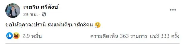 ล่าสุดทางด้าน เนเงิน หรือ เจตริน ศรีสังข์ อดีตนักมวยแฟนหนุ่มของนักร้องสาว ก็เคลื่อนไหวต้อนรับเดือนตุลาคมเช่นกัน โดยโพสต์ข้อความว่า ขอให้ตุลาจงปรานี ส่งแฟนดีๆมาสัก8คน ทำเอาแฟนคลับแห่คอมเมนต์กันรัวๆ ขณะที่แฟนๆหลายคนคอมเมนต์ทั้งให้กำลังใจทั้งแซว อาทิ พี่เนสะอย่าง ต้องมากกว่า10 , พอม้าย8คนน้องบ่าว , ขอเป็นคนที่8 , ส่งมานี้บ้างนะ บ้างก็แซวเรื่องอดีตแฟนสาวตั้งท้องแล้ว เป็นต้น